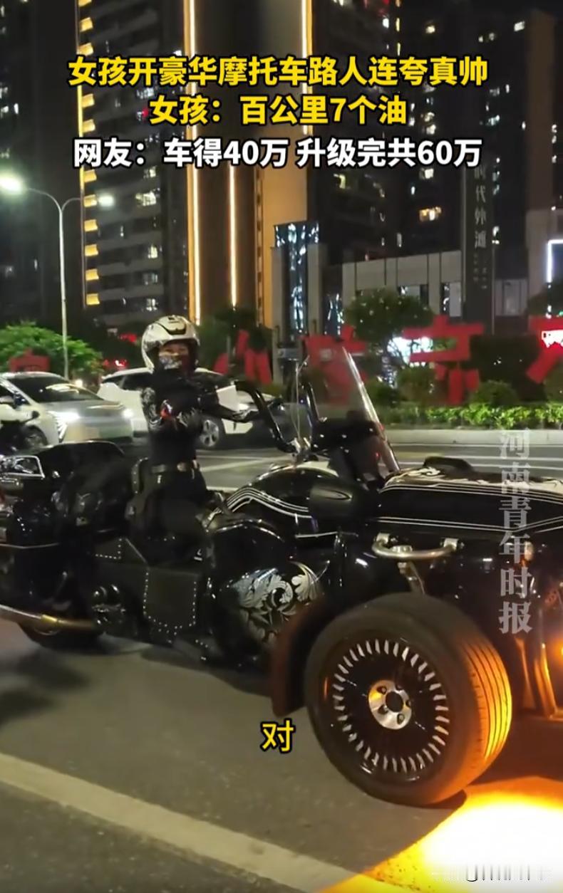 据悉,摩托车为一辆外观霸气的黑色巡航摩托,其裸车价格约为40万元,经过全套改装升级后,总成本高达60万元,女骑手本人透露,该车百公里油耗大约为7个油