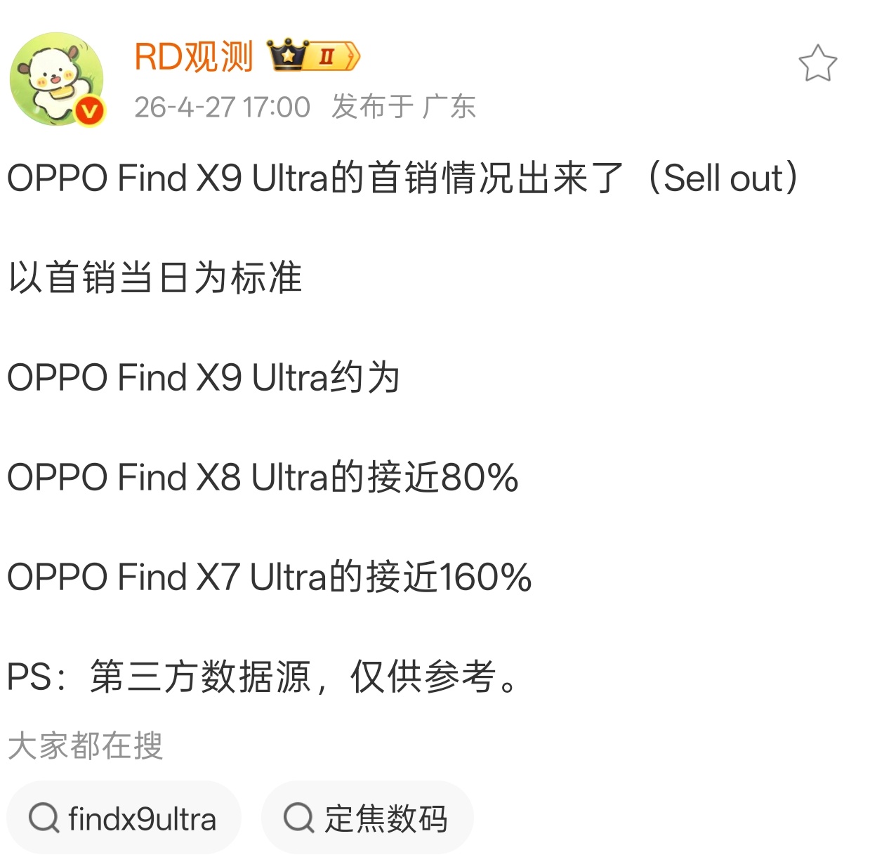 OPPO Find X9 Ultra首销成绩单出炉!按第三方数据,首销日销量是X8 Ultra的近80%,比X7 Ultra直接翻倍到160%。在当前行业全线涨价、用户购机成本飙升的大环境下,这份成绩对比前两代格外亮眼,绿厂高端影像旗舰的基本盘依然稳得住!OPPOOPPOOPPO手机oppofindx9ultra