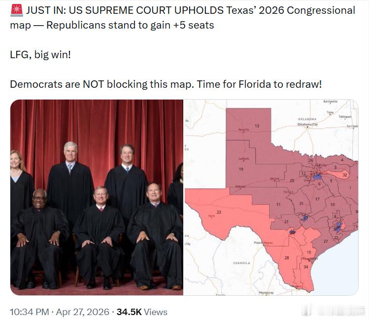 美国最高法院维持了德克萨斯州2026年国会选区地图的合法性——共和党有望因此增加5个席位。