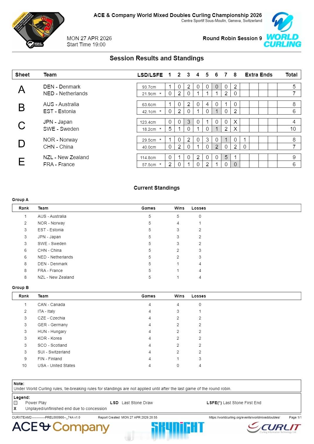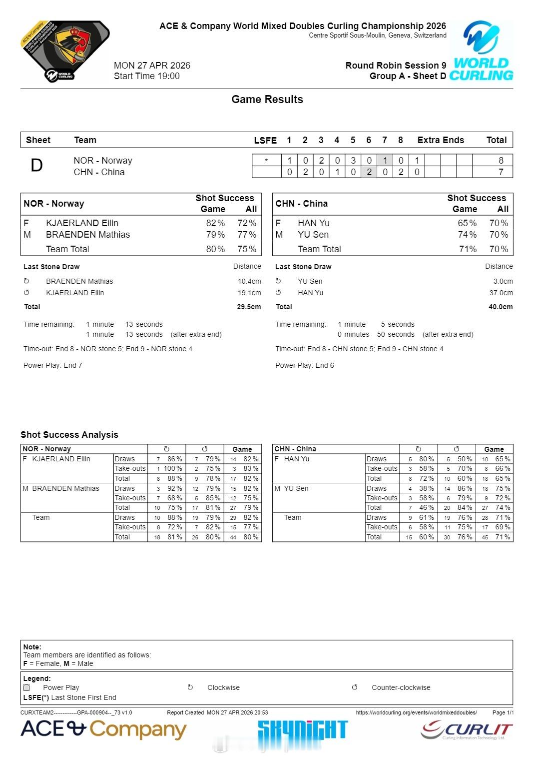 【冰壶混双世锦赛中国加局7-8惜败挪威】2026混双冰壶世锦赛 4月27日瑞士日
