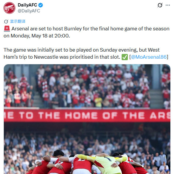 🚨阿森纳本赛季最后一个主场比赛已确定在5月18日(周一)晚20:00 进行,对手是伯恩利。该场比赛原定于周日晚间进行,但由于西汉姆联客场挑战纽卡斯尔的比赛优先获得了该时段,阿森纳对阵伯恩利的比赛因此调整为周一晚间开球。✅
