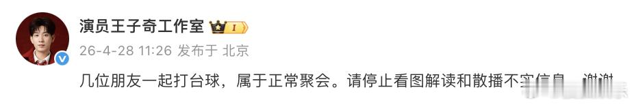 王子奇工作室否认恋情针对狗仔曝王子奇恋情一事,工作室发文否认:“几位朋友一起打台球,属于正常聚会。请停止看图解读和散播不实信息,谢谢。 ”