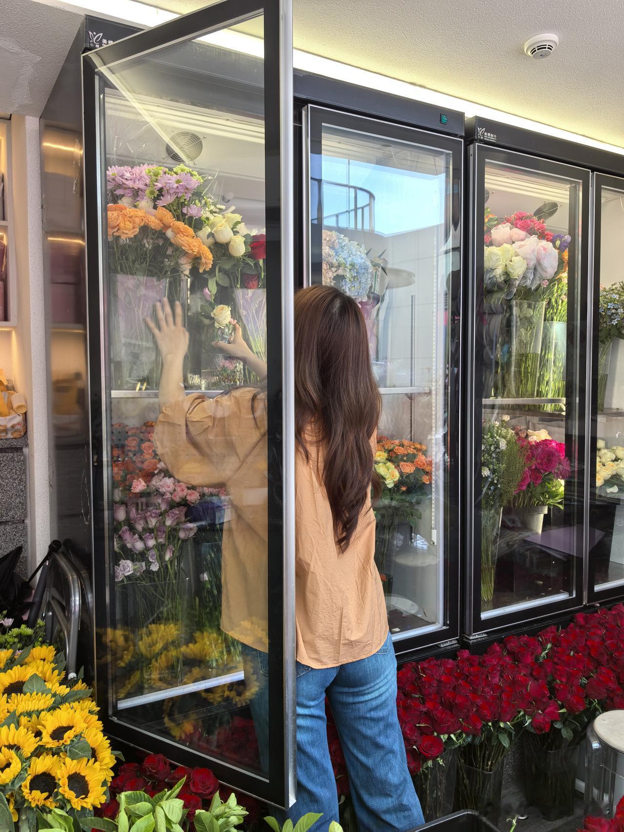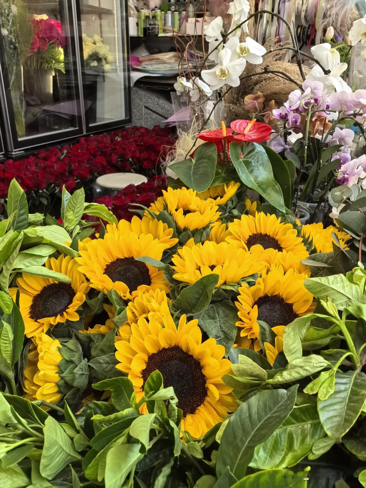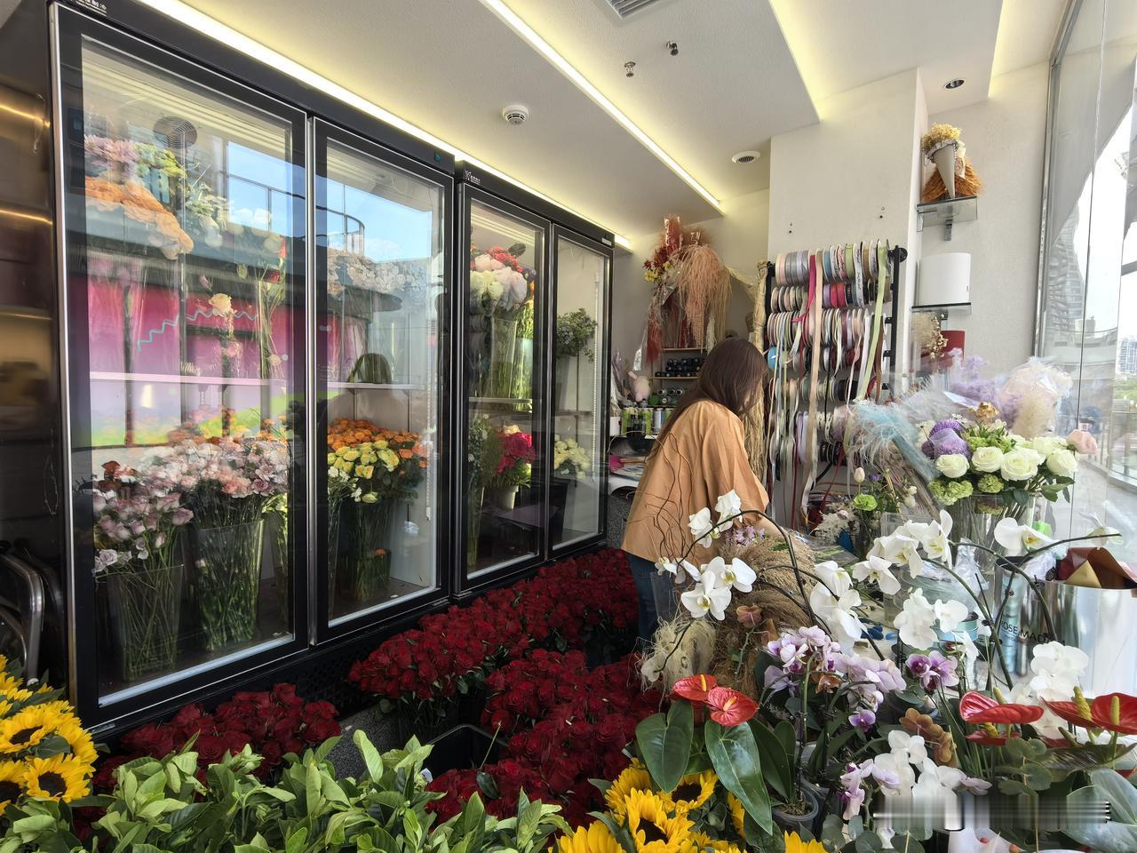 虽然店面空间找,但花种类挺多,不少花放在冰箱里,花会冷吗??最显眼的向日葵🌻和红色玫瑰,不知道贵不贵?!