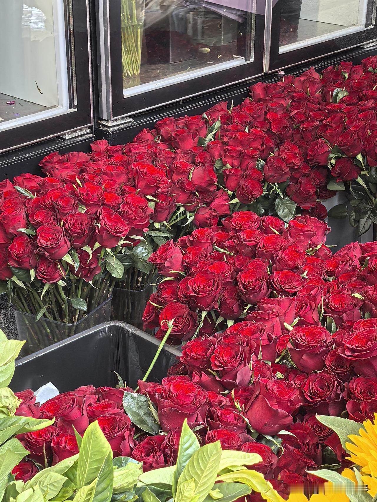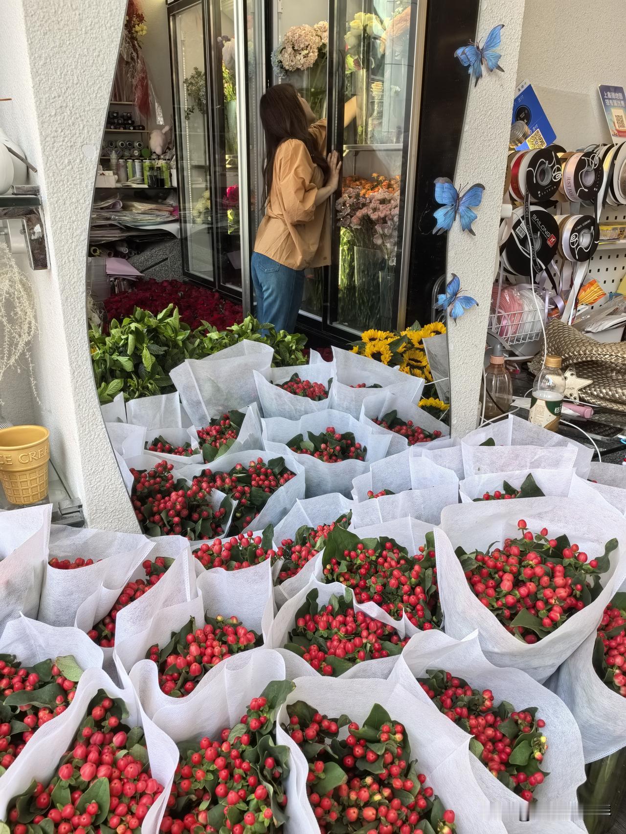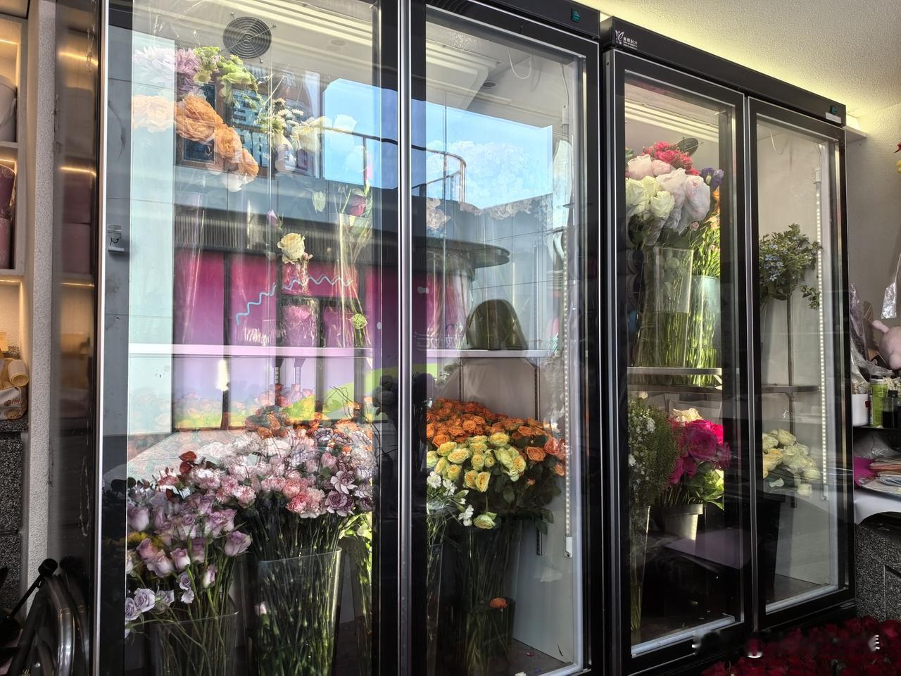 虽然店面空间找,但花种类挺多,不少花放在冰箱里,花会冷吗??最显眼的向日葵🌻和红色玫瑰,不知道贵不贵?!