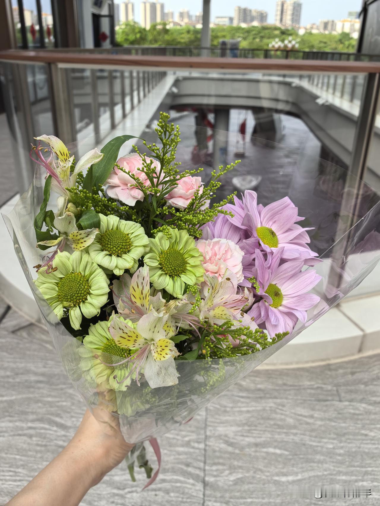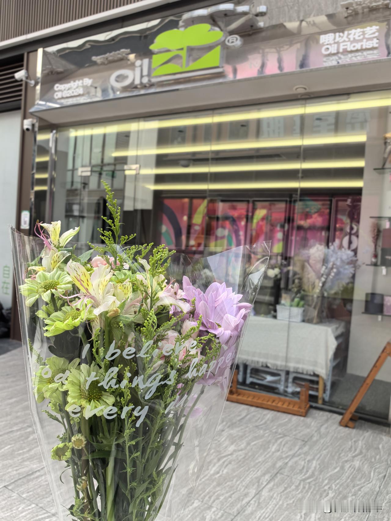 这家小店在惠州江北中海环宇天地,这一片商区蛮大的,有点不太好找,在二楼,从希尔顿酒店🏨旁电梯上去最快。美女老板帮我挑选了几种花花🌹,特意选了有花苞,能放久的。回来上网查了查,小雏菊为主,颜色搭配得挺好看,送了营养剂,希望能放久点。