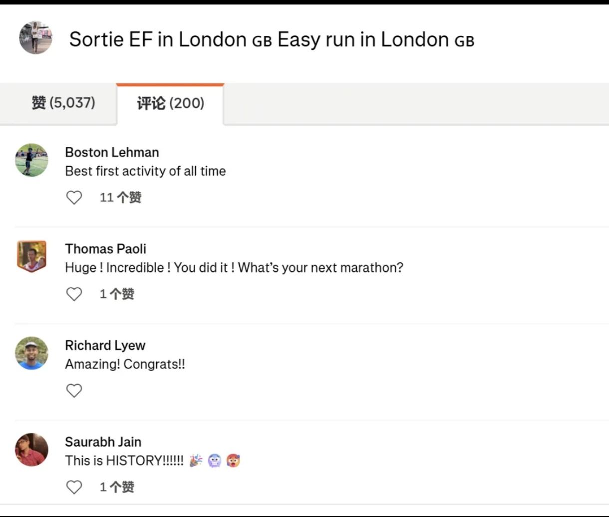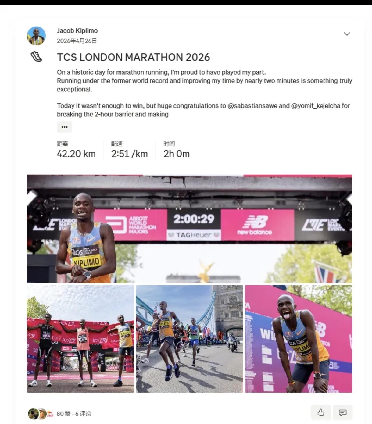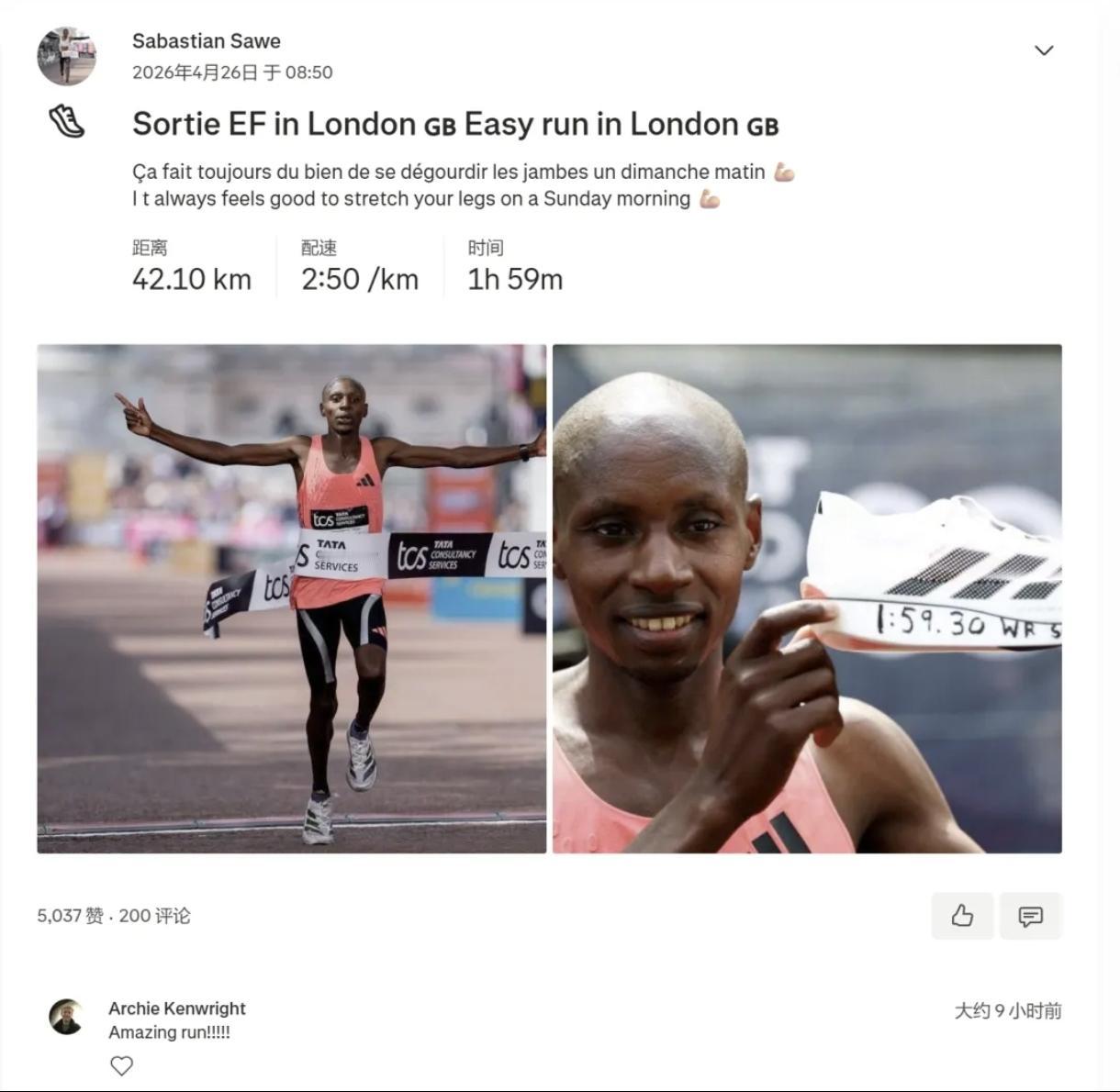 他赛后上传运动记录,全程仅42.1公里,配速2分50秒,还凡尔赛标注伦敦轻松跑。