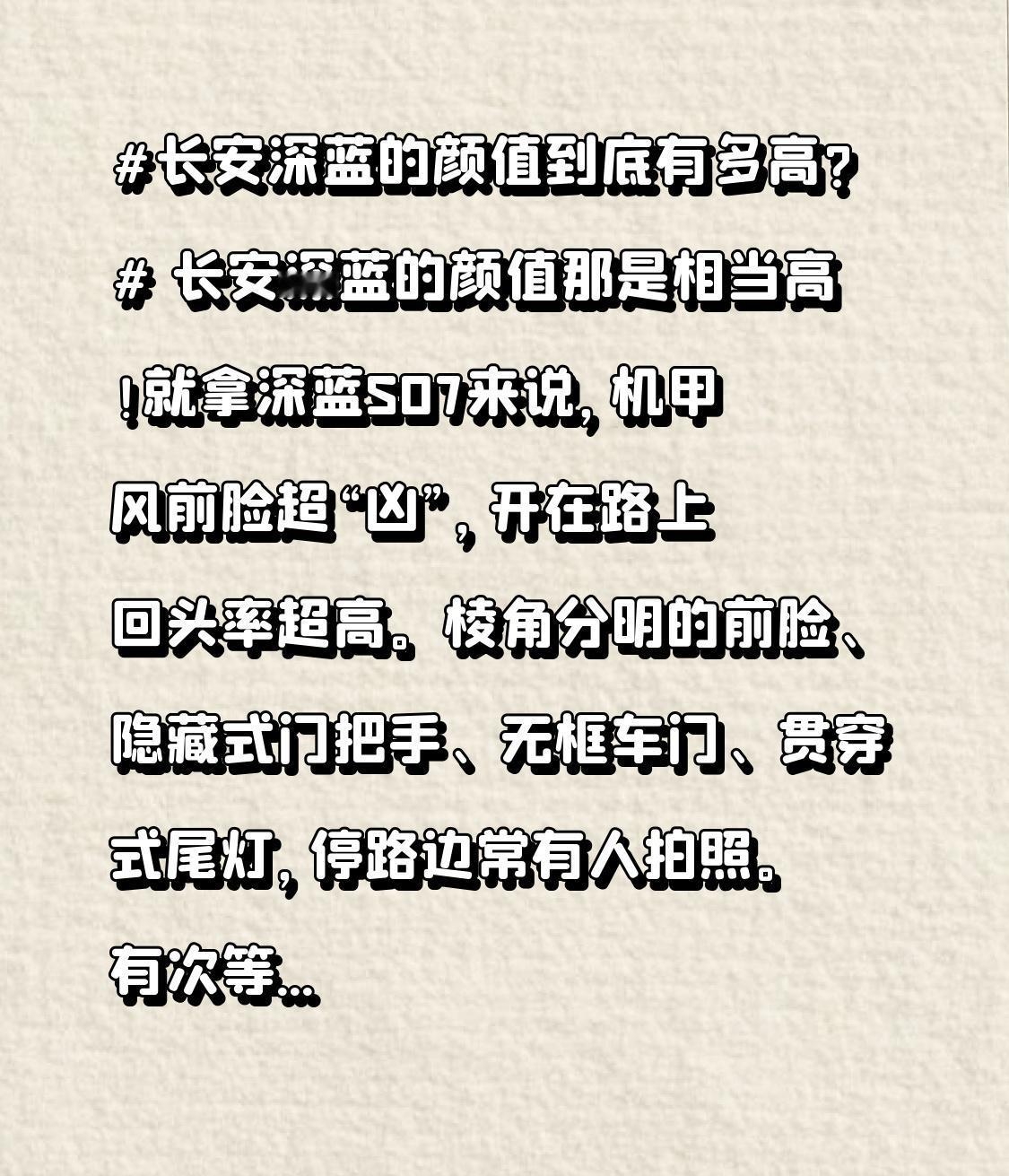 长安深蓝的颜值到底有多高? 长安深蓝的颜值那是相当高!就拿深蓝S07来说,机甲风前脸超“凶”,开在路上回头率超高。棱角分明的前脸、隐藏式门把手、无框车门、贯穿式尾灯,停路边常有人拍照。有次等红灯,开特斯拉的大哥都以为是概念车。