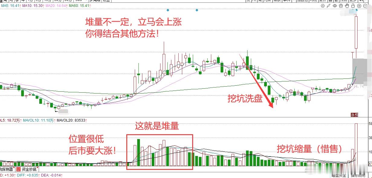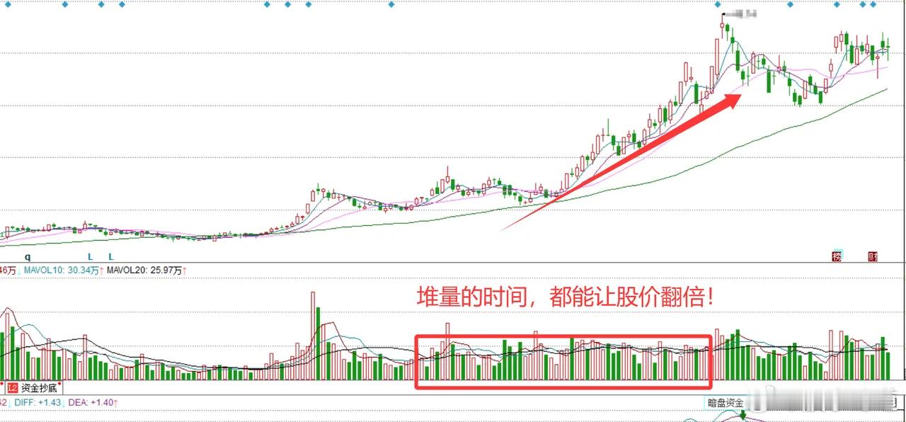 【判断的标准:成交量连续放大5个量柱及以上才能叫堆量】来看案例,如图1。我标注的1、2、3三个位置,其中只有2和3才能算堆量,注意哈,1这个位置不算堆量,2这个位置刚好到了堆量的界点、勉强可以叫做堆量。只有3这个地方,是非常正宗非常标准的堆量,它放量的量柱已经远超过5个交易日了。记住各位,堆量的时间越久、堆量的面积越大,往往后续的爆发力会越强。市场当中那么多股票,每天堆量的品种不计其数,但是密集堆量和长期堆量的可就不那么多了,与其在一些“小土堆”级别的堆量的股票里面进进出出,不如花点时间寻找真正堆大量的股票去一支持有。 【第二个案例:堆量的时候,横有多久,竖有多长!】大家来看图2,堆量的时间我都给你们框出来了,时间跨度是不是很长?后续股价直接翻倍了。而且在它堆量的过程中,股价就已经具有了很明显的涨幅,你在其中的盈利,甚至不必依靠后续的主升! 【第三个案例,堆量之后也有可能会出现挖坑洗盘】大家看图3,堆量结束之后,股价出现了为期两周左右的缩量下跌,后面构筑了一个整理的、缩量的平台,主力资金莫非已经走了吗?非也,不仅没有走,反而是在挖坑的时候一直在挑选拉涨的时机。挖坑时候的缩量,不是主力资金走了,而是主力资金在吸足筹码之后的惜售行为所导致的。你看,时机到了之后,后面的涨幅是很丰厚的。 总结一下:堆量是可以被界定出来的,并且,堆量也会分三六九等。好的堆量整理区间非常明显,股价稳稳盘整或者缓慢抬升,量能释放极其显著并且维持时间较长,一般的堆量放量的量柱参差不齐,股价波动很大,很有可能后续会走坏。更为具体的分析,我们之后会再出一些案例给大家分析。实时热搜创作激励计划今日看盘股票