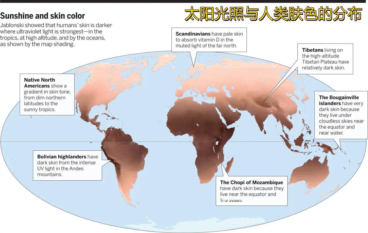 随着人类走出非洲,向各地迁移,不同地区的日照强度、紫外线强度差异巨大,造成了不同地区人类不同的肤色。