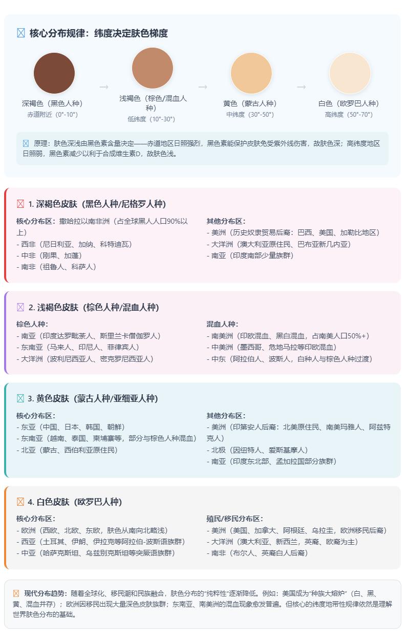 肤色只是日照强度演化出来的适应特征,纬度越低,肤色越深,赤道地区最深,肤色与体质、智商、进化优劣完全无关。