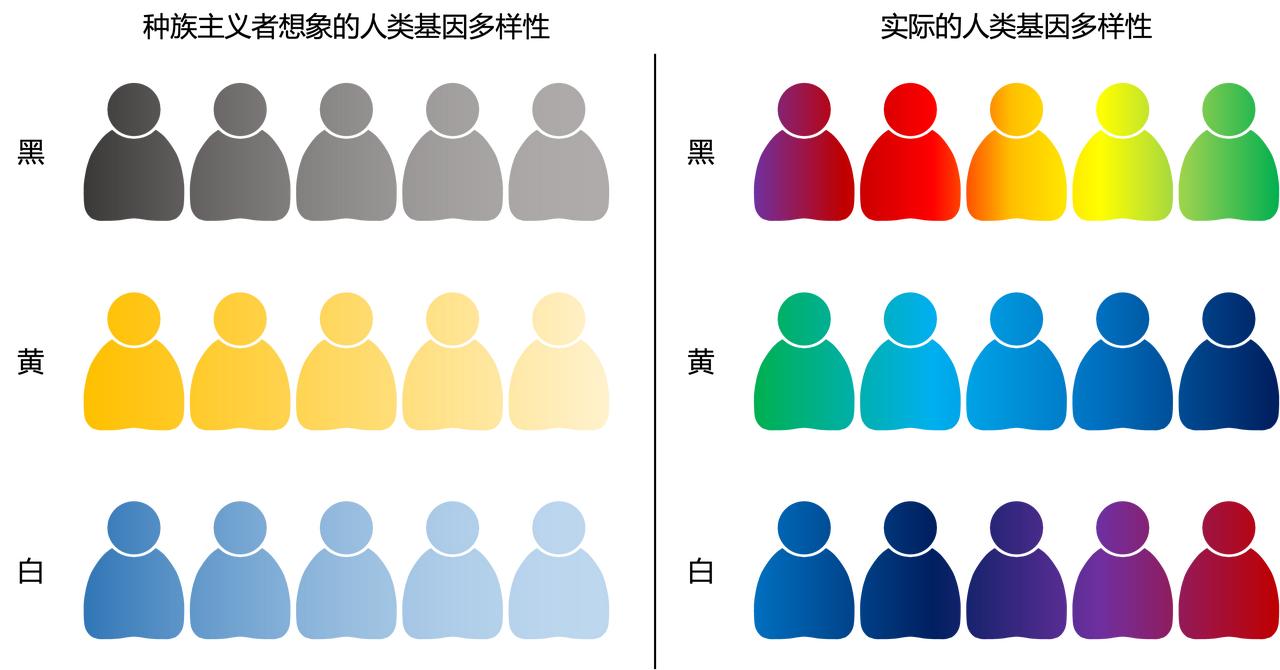 实际上人类的肤色是平滑渐变的连续分布,如东南亚地区,各国的肤色明显不同,完全不存在纯黑、纯白、纯黄清晰割裂的肤色。