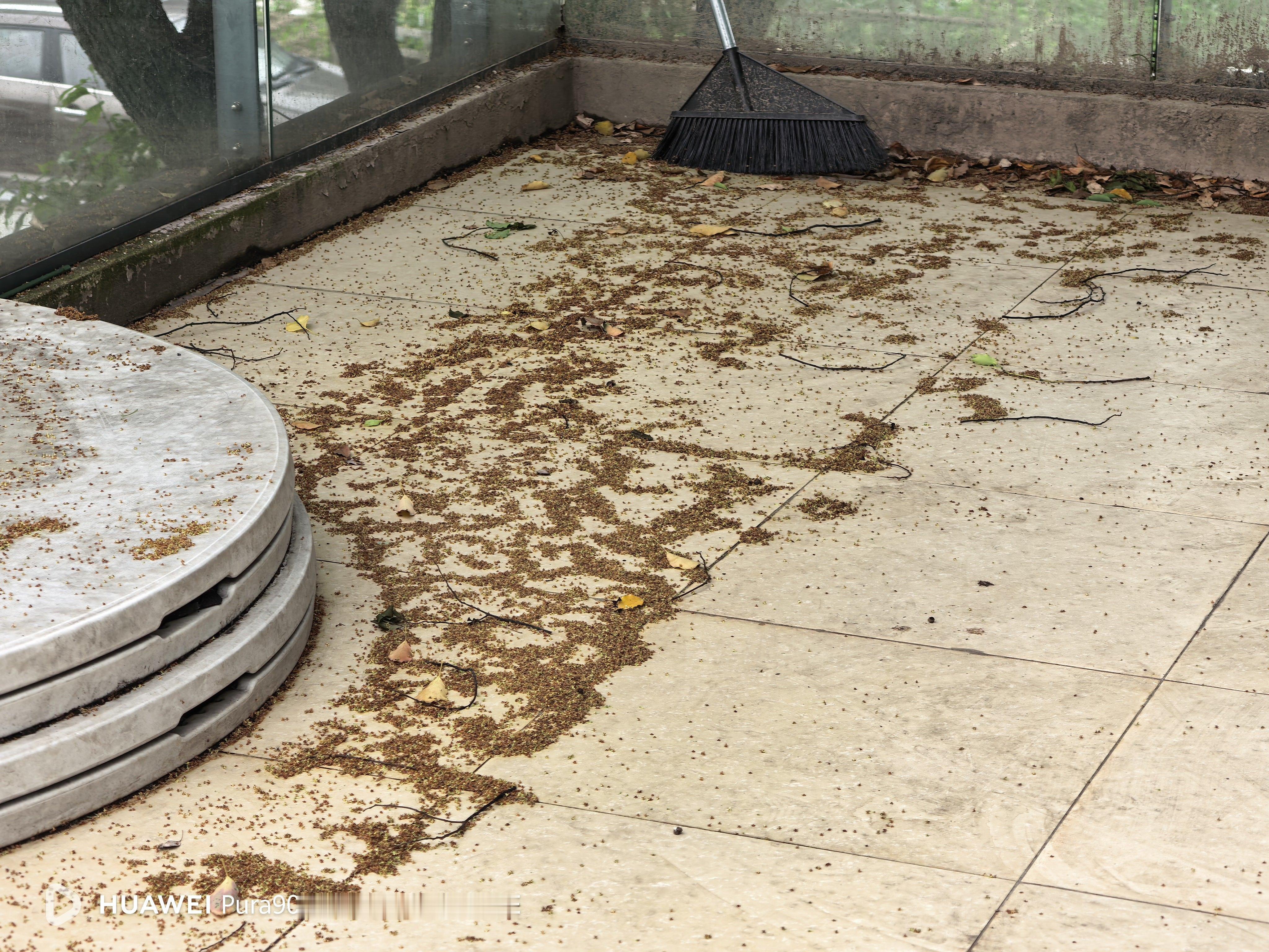 工作室门口的露台上永远都不会干净。下面的棵樟树长上来之后,从秋天开始到夏天之前就都是樟树产生的东西冬天一过开始掉樟树籽,籽掉完了要开始开花,花还挺香的,香完了这些谢掉的花又掉了。然后秋天树叶发黄,开始掉叶子几多欢喜几多愁啊。
