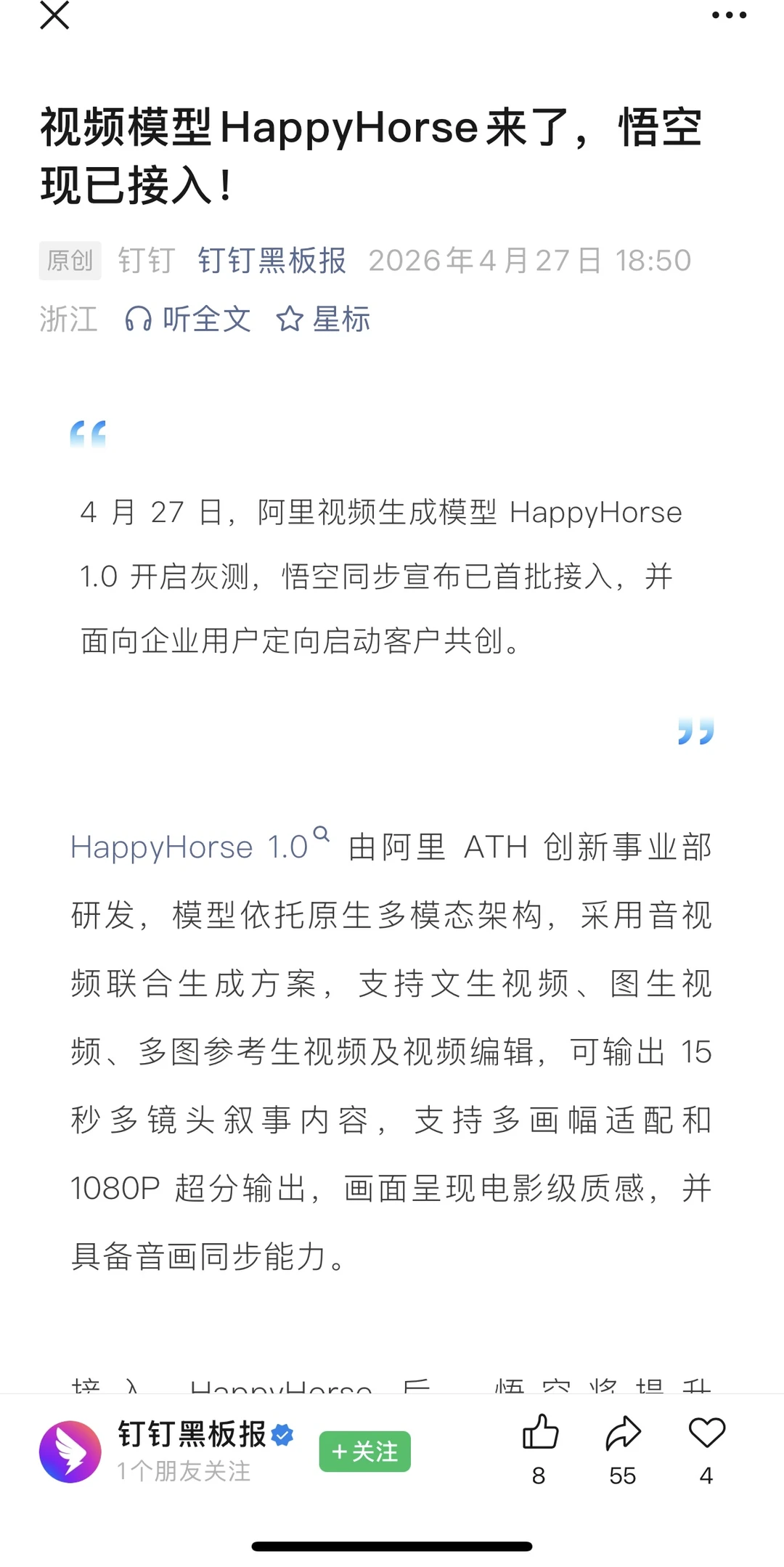 HappyHorse 1.0 今天刚开灰测,悟空那边已经接上了,还直接带企业客户一起做共创。