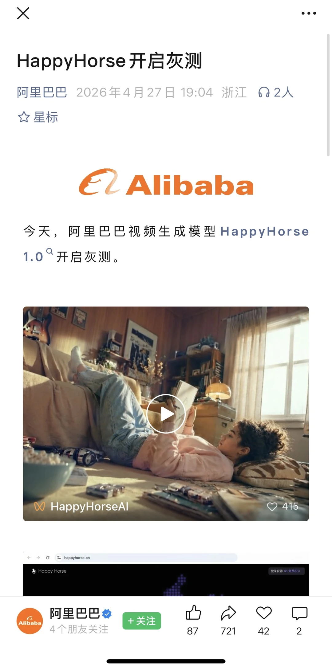 HappyHorse是阿里ATH这边做的视频模型,文生视频、图生视频、多图参考、视频编辑这些都能做,支持多镜头叙事、1080P,还有音画同步。