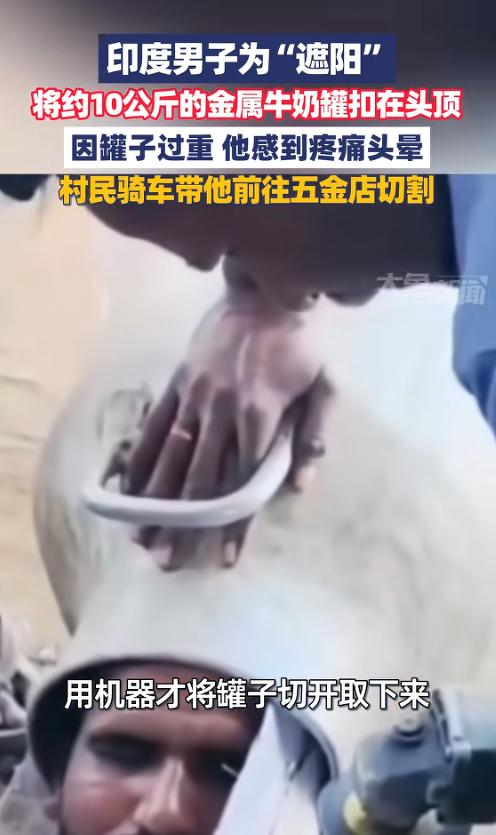 印度拉贾斯坦邦的一个村子里,一个叫卡鲁拉姆的男子,大热天出门干活,为了挡太阳,居然把一个十公斤重的铁皮牛奶罐子直接扣在了自己脑袋上。