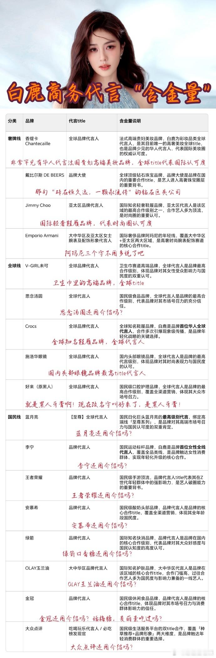 白鹿商务代言含金量白鹿商务代言含金量好高,全是国民级品牌,在90花商务水平top