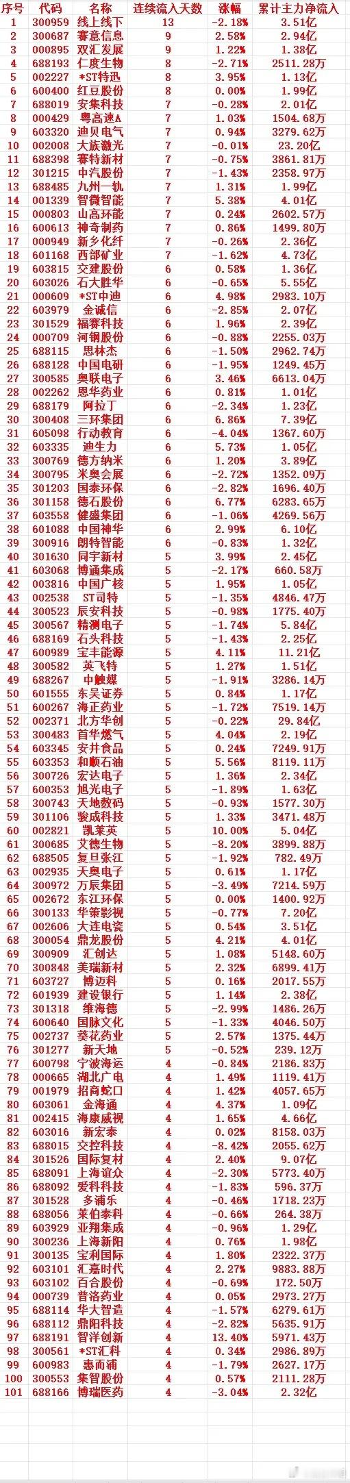 1 300959 线上线下 13 -2.18% 3.51亿2 300687 赛意信息 9 2.58% 2.94亿3 000895 双汇发展 9 1.22% 1.38亿4 688193 仁度生物 8 -2.71% 2511.28万5 002227 *ST特迅 8 3.95% 1.13亿6 600400 红豆股份 8 0.00% 1.99亿7 688019 安集科技 7 -0.28% 2.01亿8 000429 粤高速A 7 1.03% 1504.68万9 603320 迪贝电气 7 0.94% 3279.62万10 002008 大族激光 7 -0.01% 23.20亿11 688398 赛特新材 7 -0.75% 3861.81万12 301215 中汽股份 7 -1.43% 2358.97万13 688485 九州一轨 7 1.31% 1.99亿14 001339 智微智能 7 5.38% 4.01亿15 000803 山高环能 7 0.24% 2602.57万
