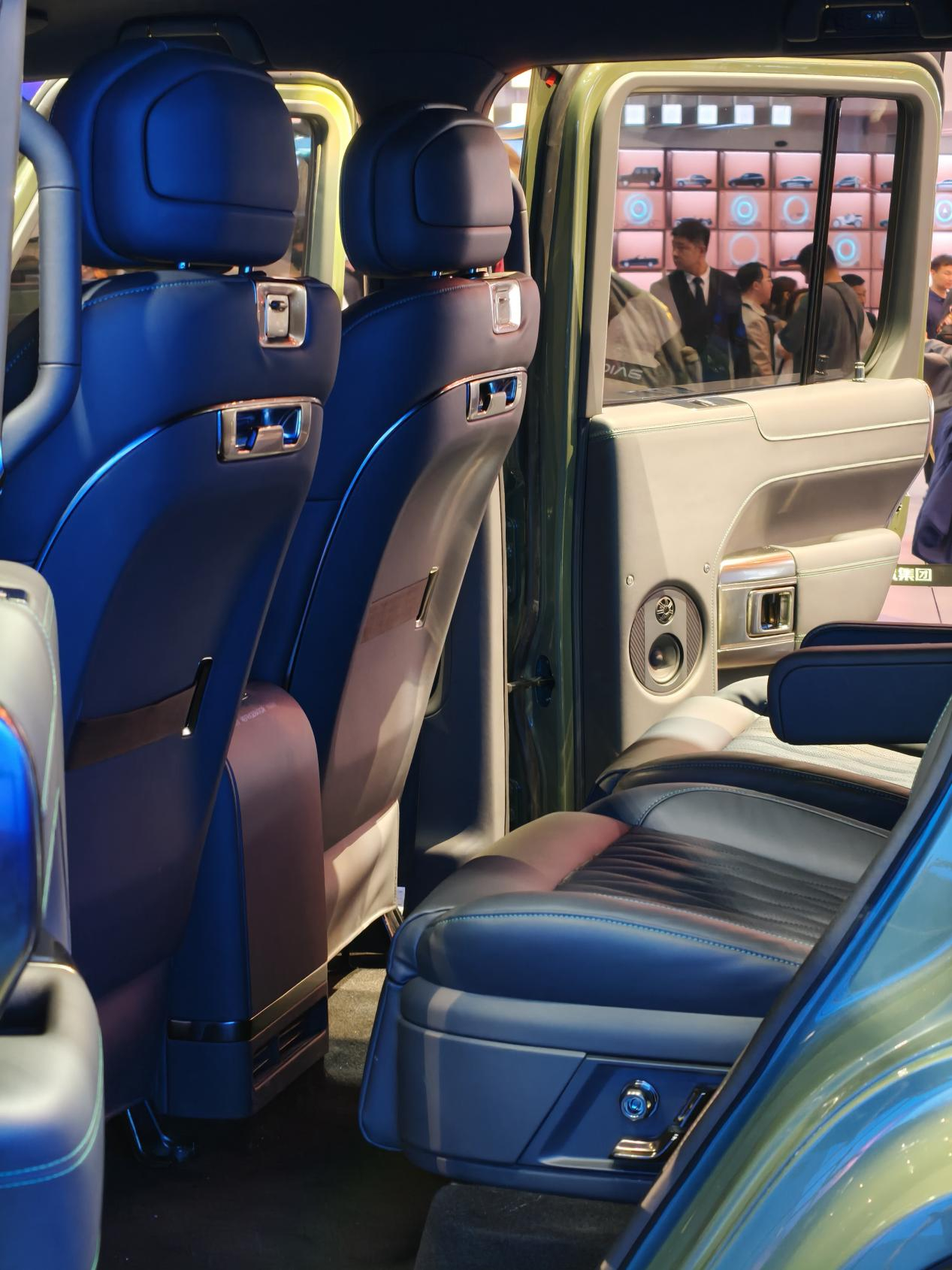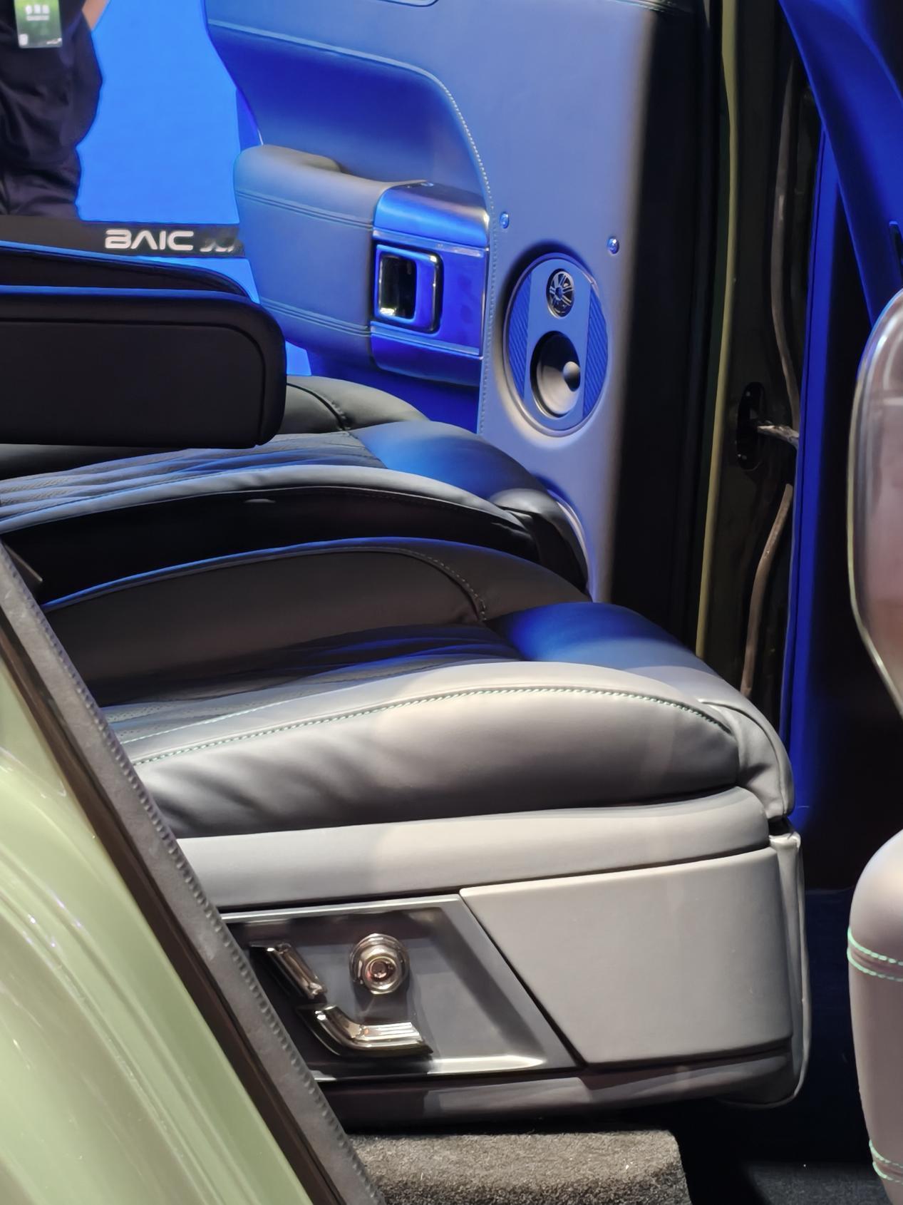 在车内还可以看到,中控屏幕下方给到了水平仪,虽然仍是电子显示,但专属模具带来了满满的仪式——在之前的二代勇士上,这也是需要选装的配置。另外,整车内饰工艺材质相比之前的北京越野车型有很大提升,基本上是以皮革和金属为主。甚至能看到后排给到了两张独立座椅,并且第二排带有腿托,第二排腿部空间应该是相当富裕的,第二排座椅还有按摩功能。北京81还有第三排座椅,意味着北京81有2+2+2的6座版的高端车型。