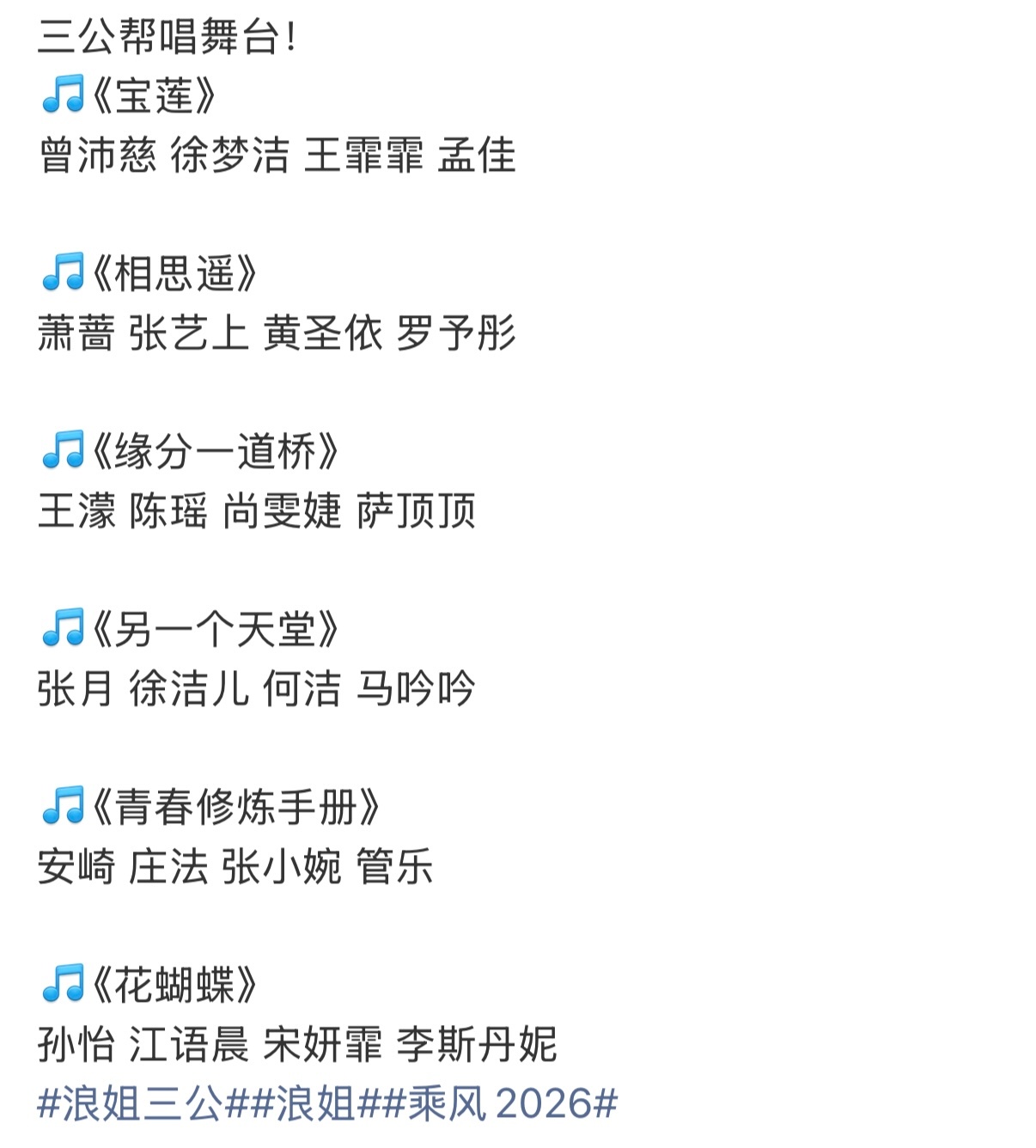 浪姐三公帮唱舞台网传浪姐三公合作秀分组➕歌单: