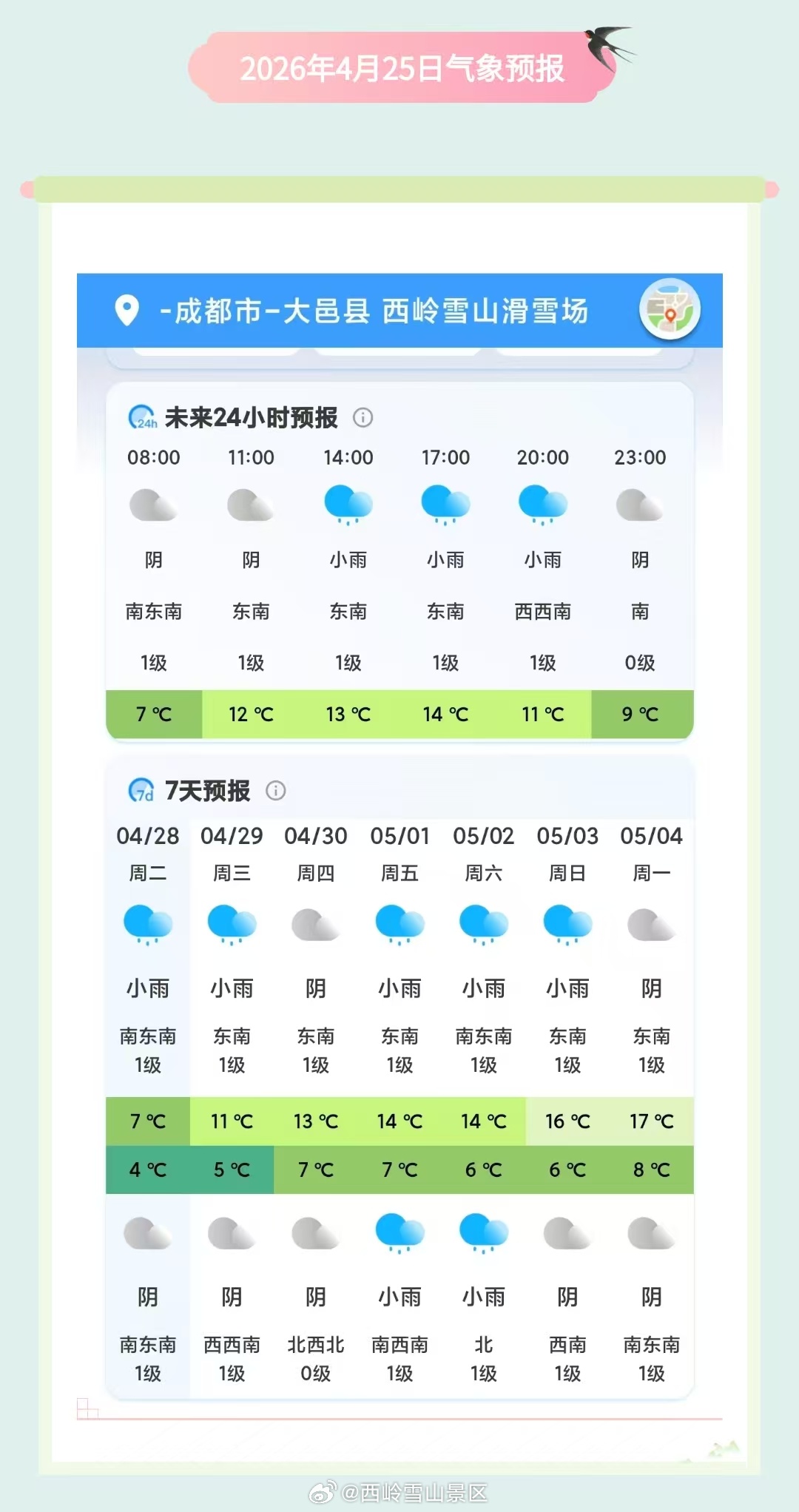 西岭雪山4月29日(周三)气象预报#西岭雪山#