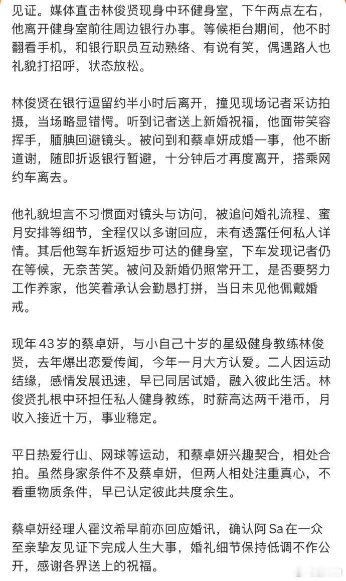 蔡卓妍林俊贤早已完成婚礼仪式蔡卓妍林俊贤早已完成婚礼仪式,人家很低调的啦! 曝蔡卓妍林俊贤已举办婚礼