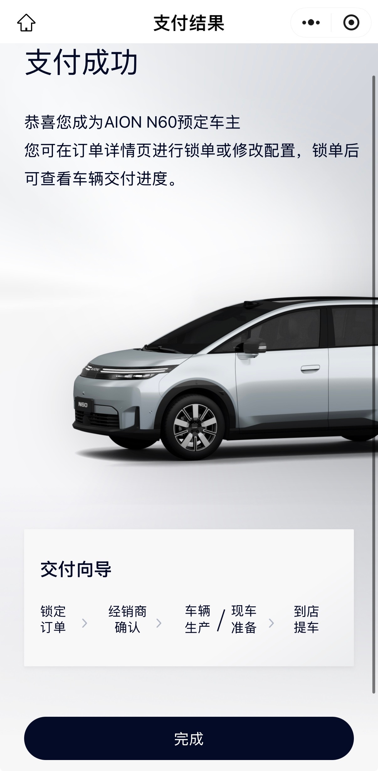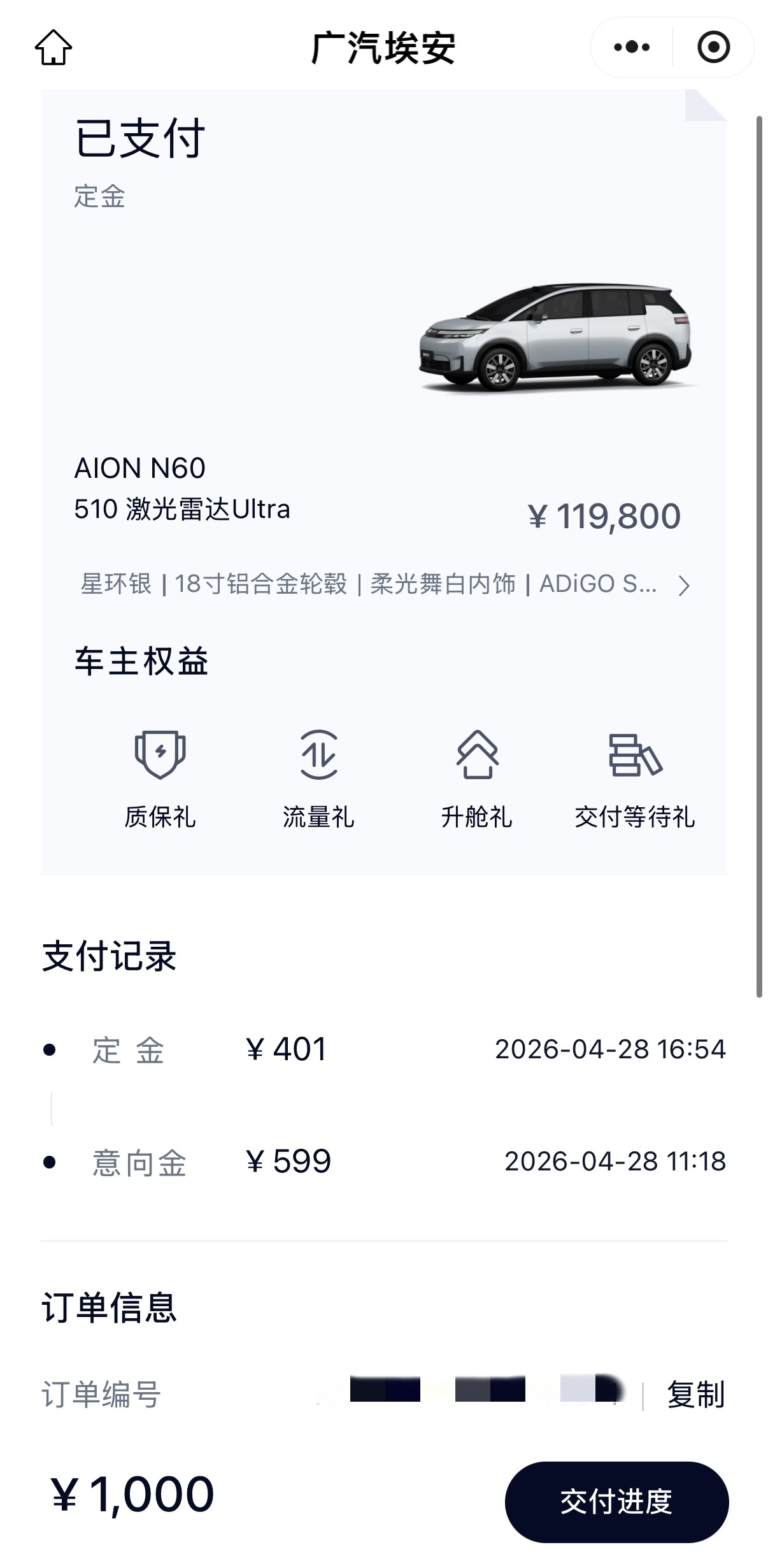 在下单这款车的时候,简单看了埃安N60的三个配置,其实除了续航里程不同以外,其他配置基本都是标配,包括激光雷达、热泵空调、副驾零重力、前排通风加热按摩记忆、全景天幕+电动遮阳帘等等,都是一样的。因此对消费者选择起来也是很简单直接,只需要考虑续航需求。