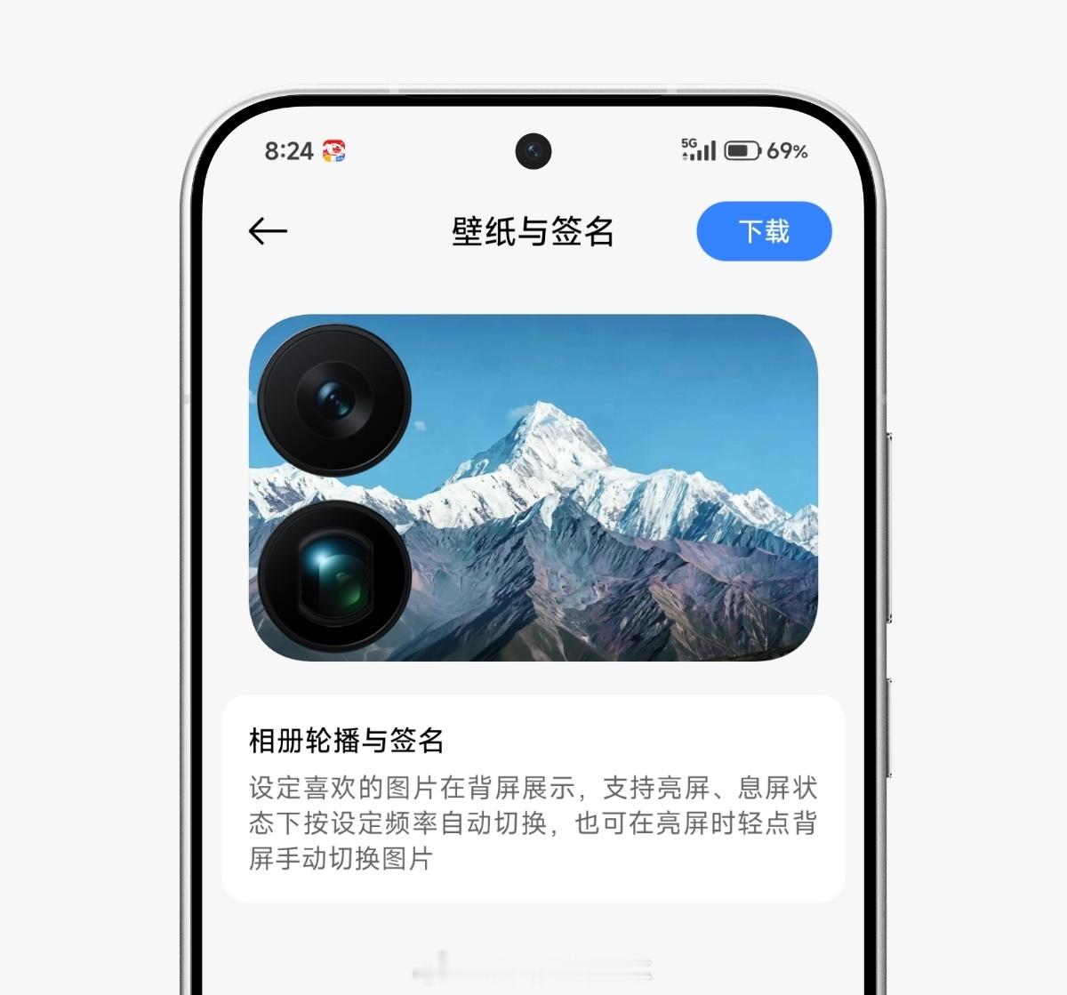 设定喜欢的图片在背屏展示,支持亮屏、息屏状态下按设定频率自动切换,也可在亮屏时轻点背屏手动切换图片。