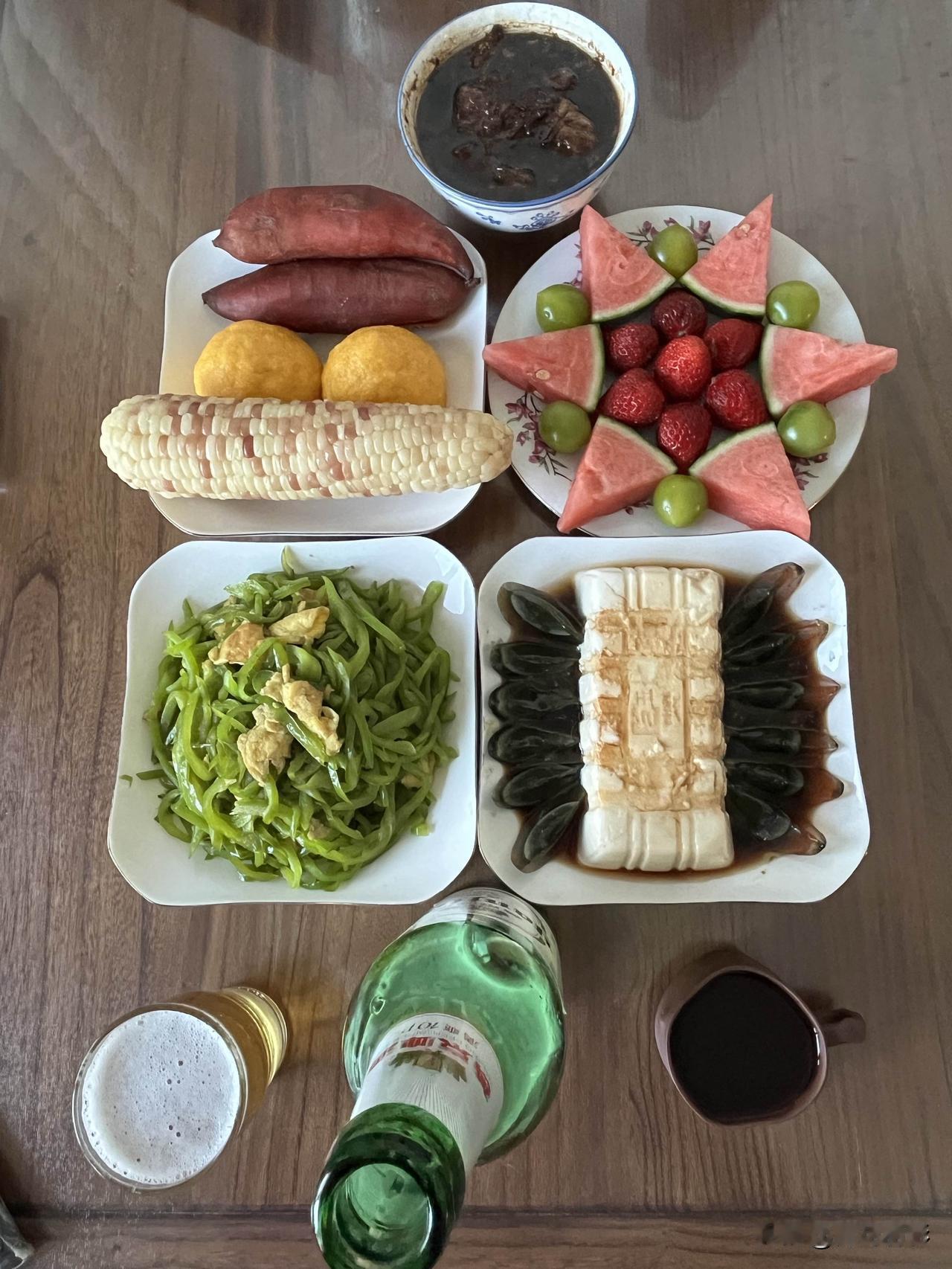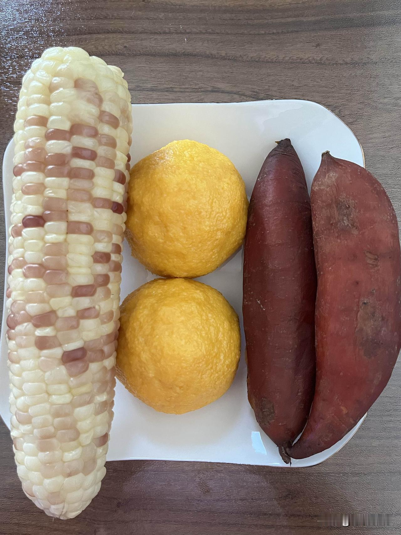 今天我蒸了八个小窝头,还蒸了几根红薯,把剩的一点儿拆骨肉也一起蒸了,用大锅煮了玉米。