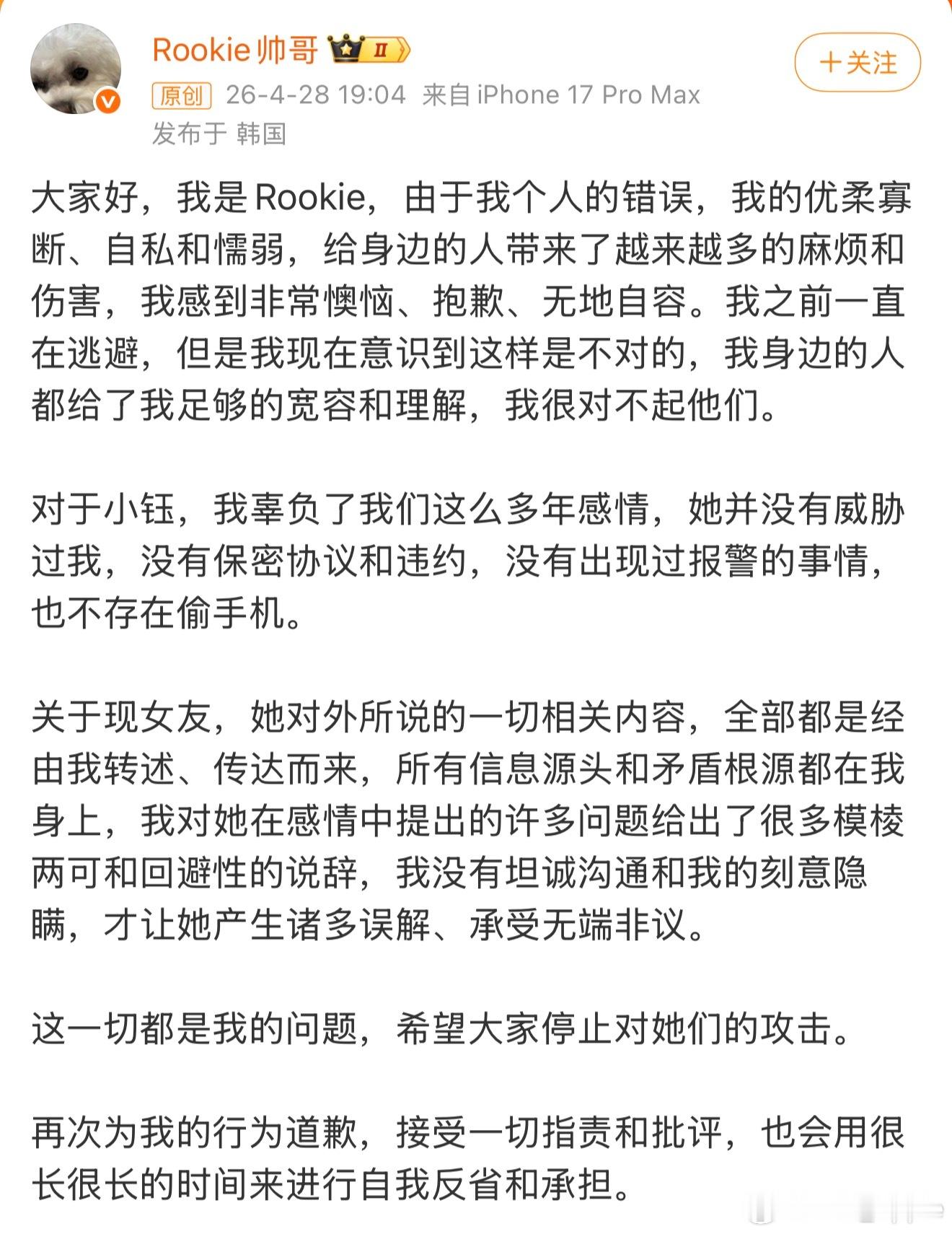 Rookie道歉Rookie发文Rookie回应女友爆料