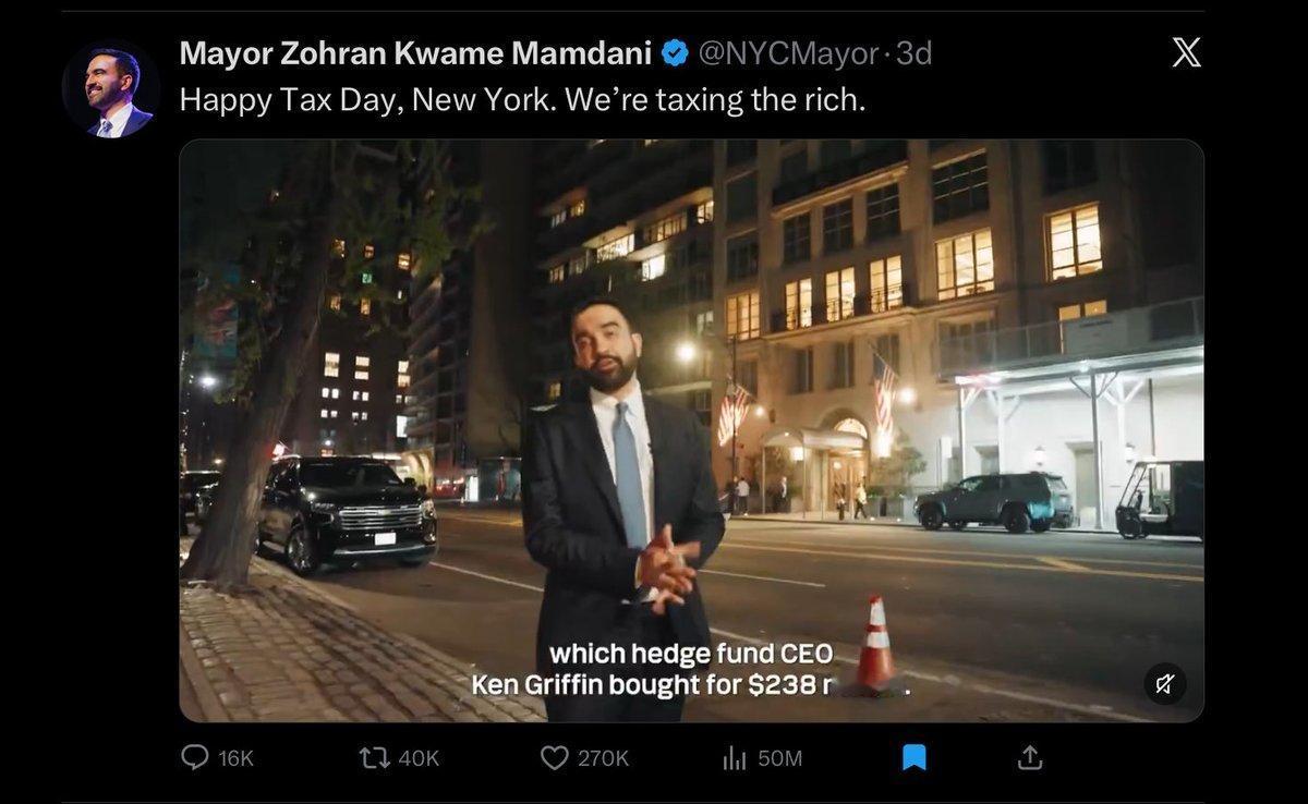 纽约市“穷人市长”马姆达尼拍对冲基金经理格里芬的顶层公寓视频发到网上,没有任何解说,没有任何煽动性语言。曼哈顿上空的豪宅,与街道上负担不起房租的人之间的垂直距离,鲜明对比,也精准命中了数百万人心里那个"凭什么"。