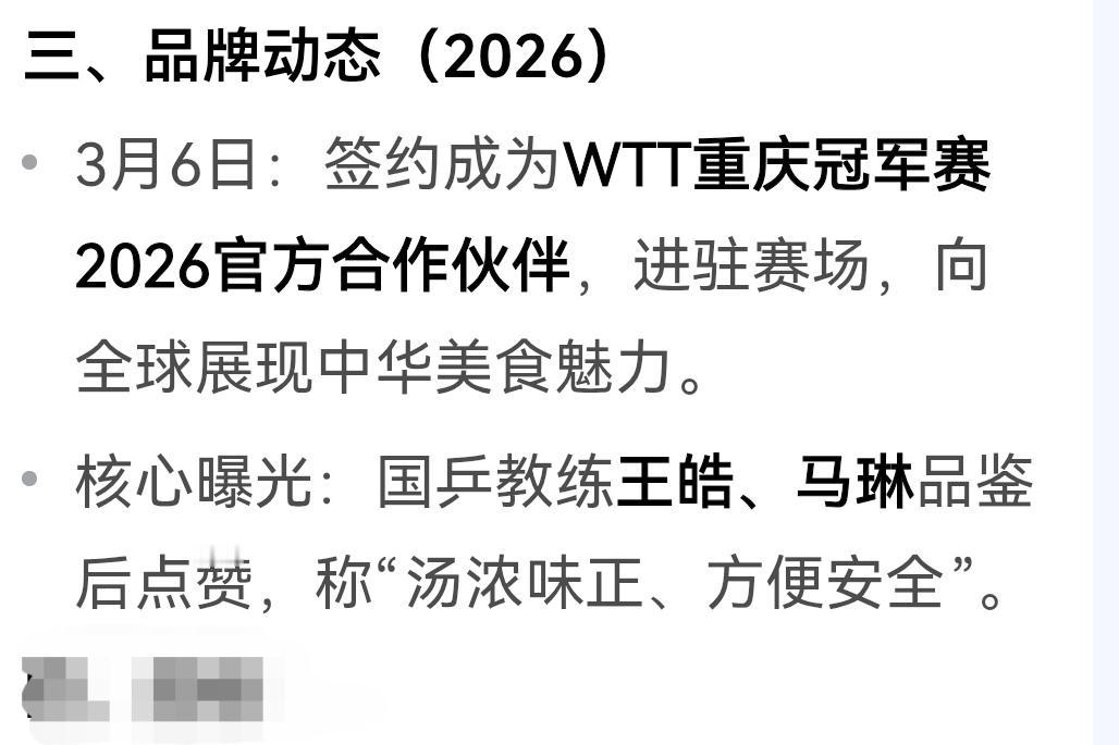 有人说国乒团队的王皓指导和马琳指导代言了这个牌子的方便面,我特意去搜索了一下,兰面到今年3月份签约成为WTT重庆冠军赛2026官方合作伙伴,王皓指导和马琳指导确实品鉴过兰面道的兰州牛肉拉面,“汤浓味正,方便安全”这八个字的点也非常给力了,不过这个牌子的方便面价格也不便宜,有机会可以尝尝。