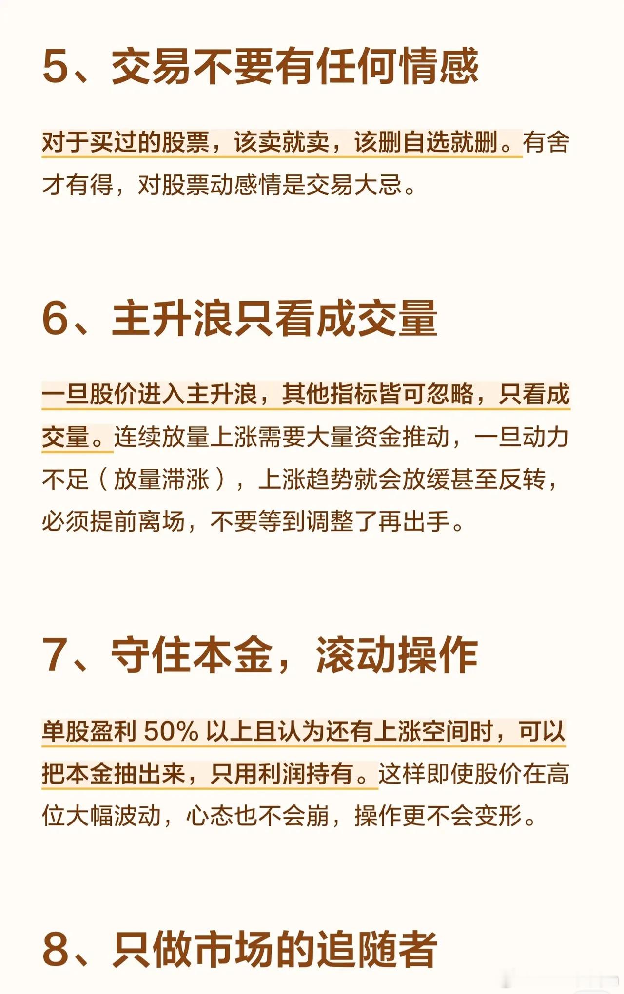 单股盈利50%以上且认为还有上涨空间时,可以把本金抽出来,只用利润持有。这样即使股价在高位大幅波动,心态也不会崩,操作更不会变形。