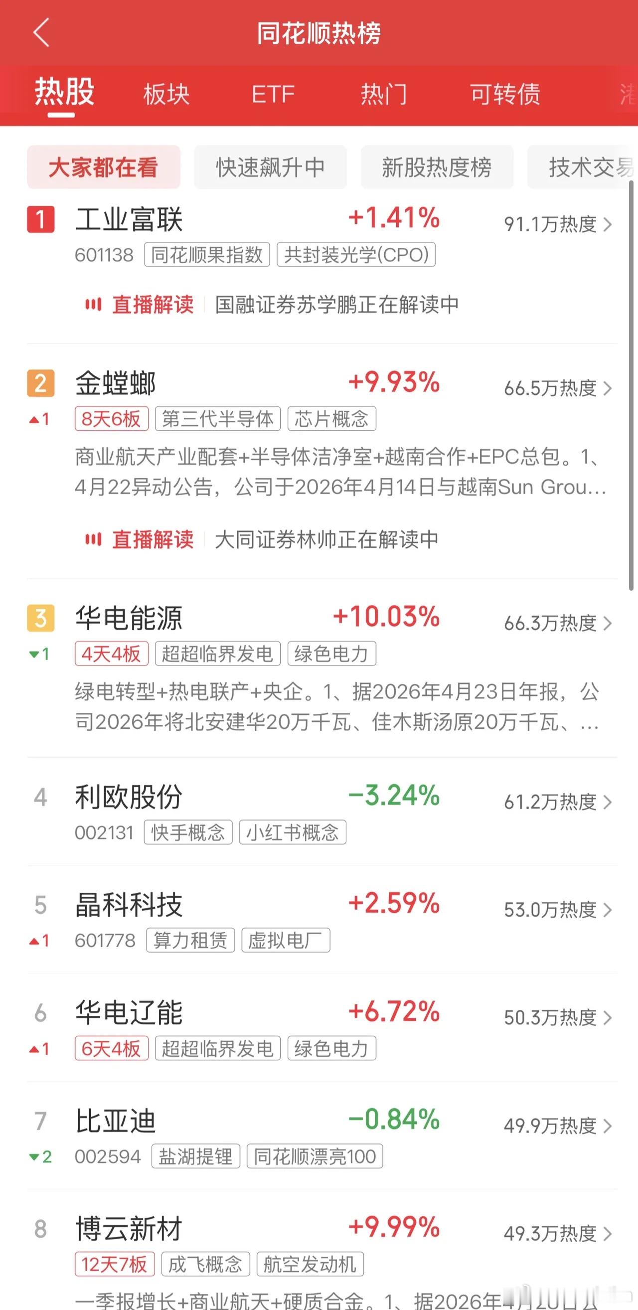 2026年4月28日,各大股吧前十热股:淘股吧: 1.水发燃气 2.金螳螂 3.东方材料 4.华电辽能 5.博云新材 6.利通电子 7.华电能源 8.德龙汇能 9.东山精密 10.药明康德 东财吧: 1.药明康德 2.华电辽能 3.博云新材 4.华电能源 5.金螳螂 6.华银电力 7.合力泰 8.利通电子 9.水发燃气 10.深圳华强 同花顺: 1.工业富联 2.金螳螂 3.华电能源 4.利欧股份 5.晶科科技 6.华电辽能 7.比亚迪 8.博云新材 9.利通电子 10.水发燃气