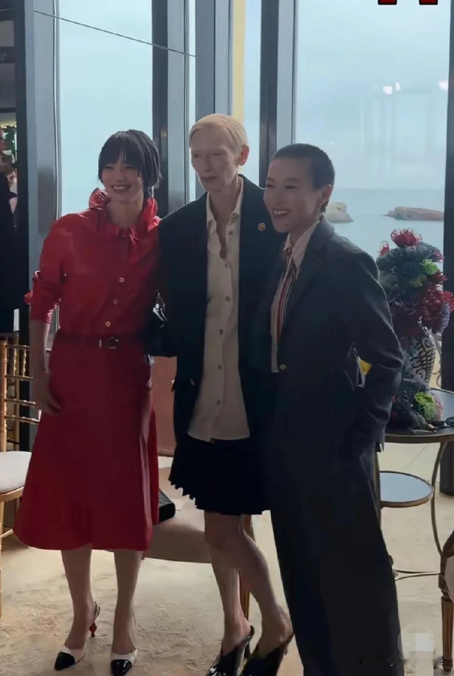 穿着西装打着领带的她,剪了一个寸头,个子很瘦,化了淡淡的妆容,和日本模特小松菜奈和英国演员蒂尔达同框,看脸像个女孩子,看侧脸、背影,就真的像个男孩,完全没有妈妈王菲年轻时的风范。