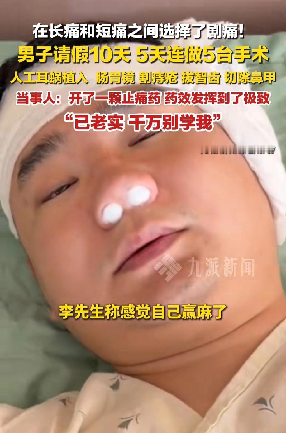 于是他跟医生商量,在5天时间里,接连做了5台手术。人工耳蜗植入、肠胃镜检查、痔疮切除、智齿拔除、鼻甲切除