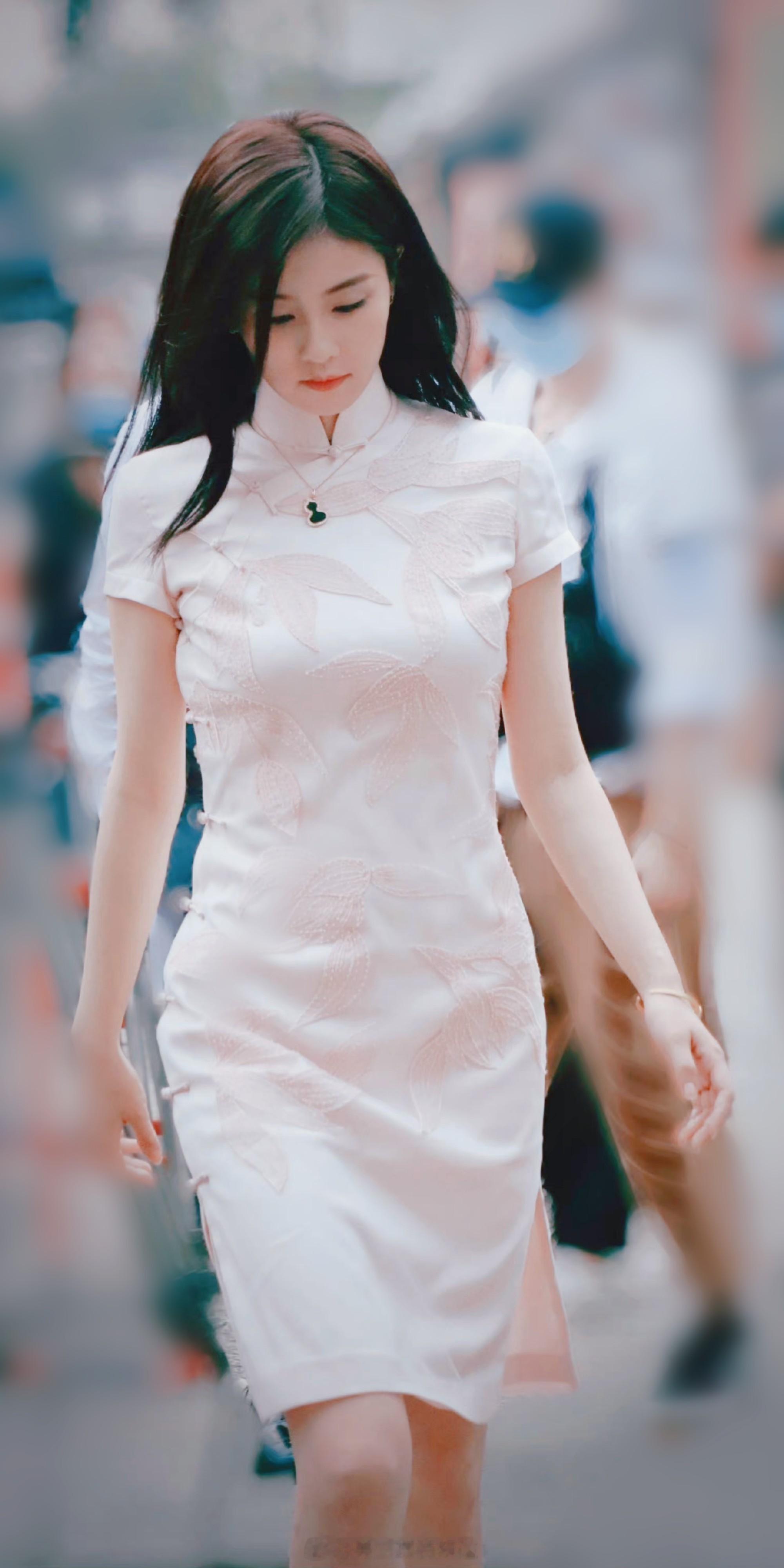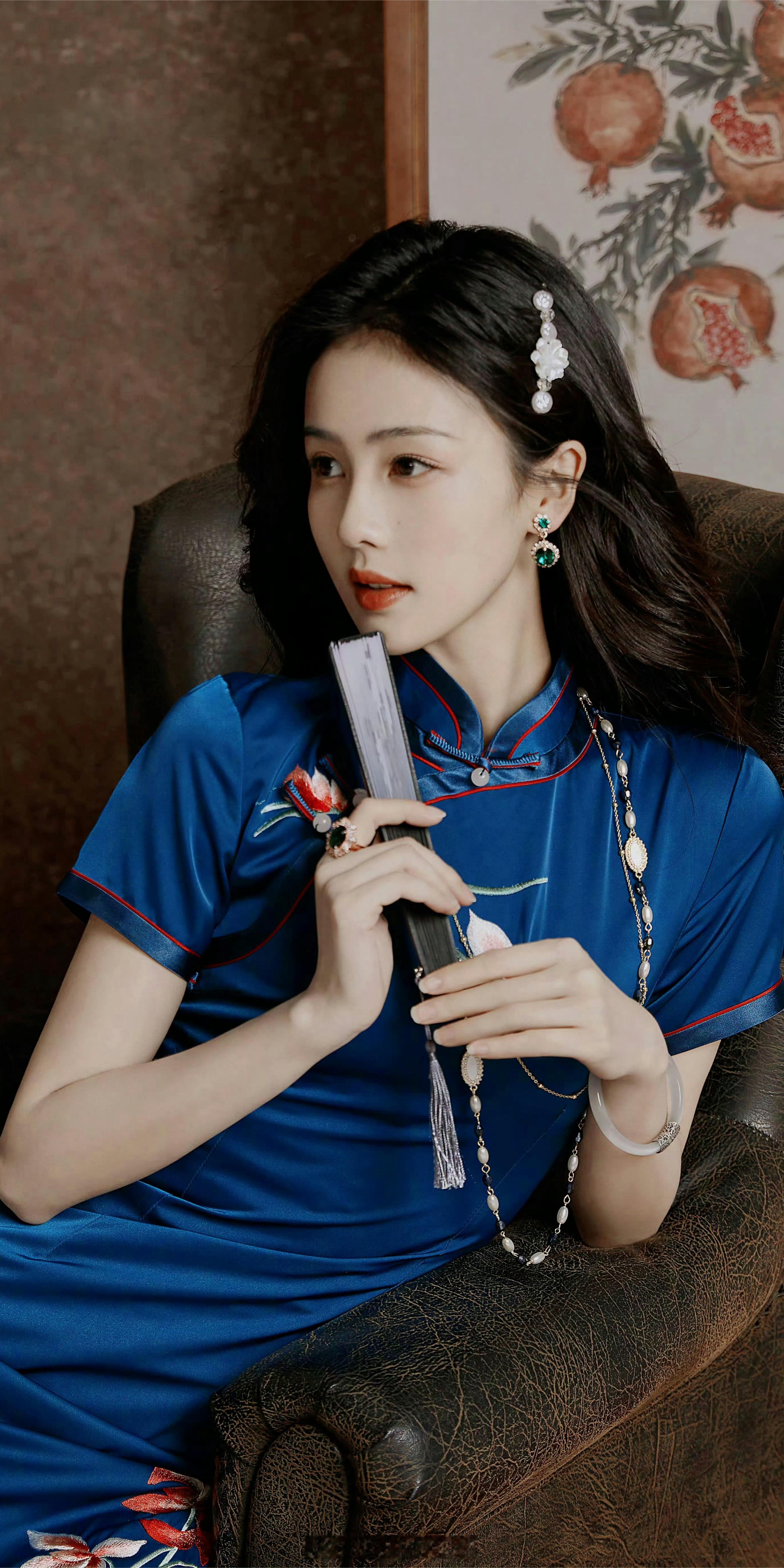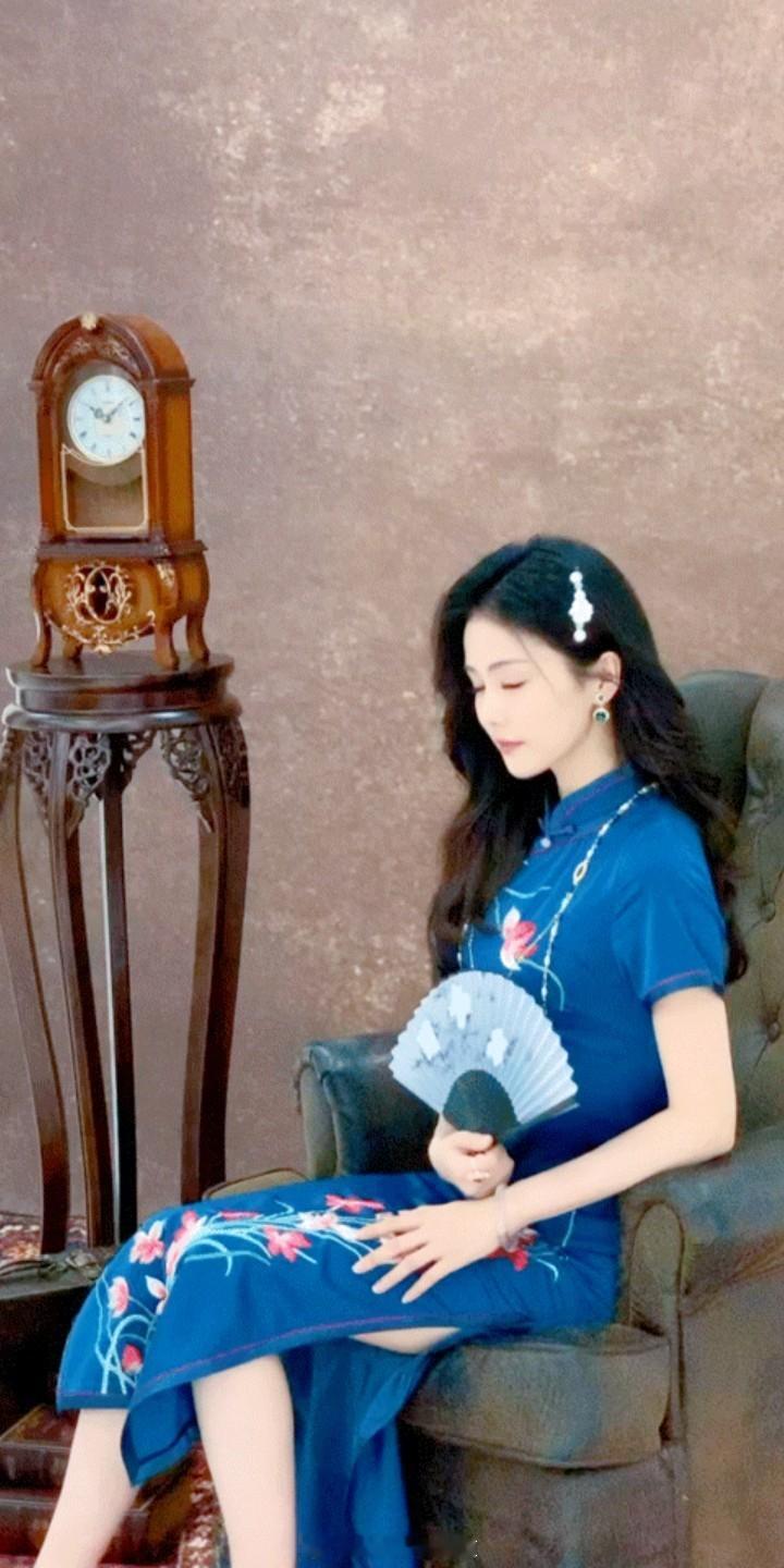 天青色旗袍裹着玲珑身段,高开叉处露出纤细脚踝,一步一摇皆是东方韵致,古雅与性感在