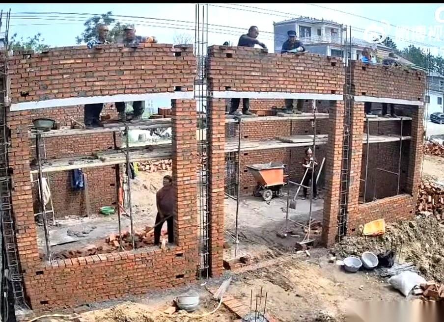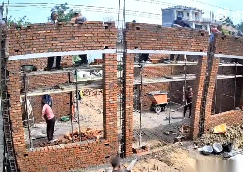 施工队为了抢工期,直接把顺序干反了——先用砖垒出个二楼的空架子,人还在上面走动,盘算着回头再往预留的空洞里浇灌混凝土。