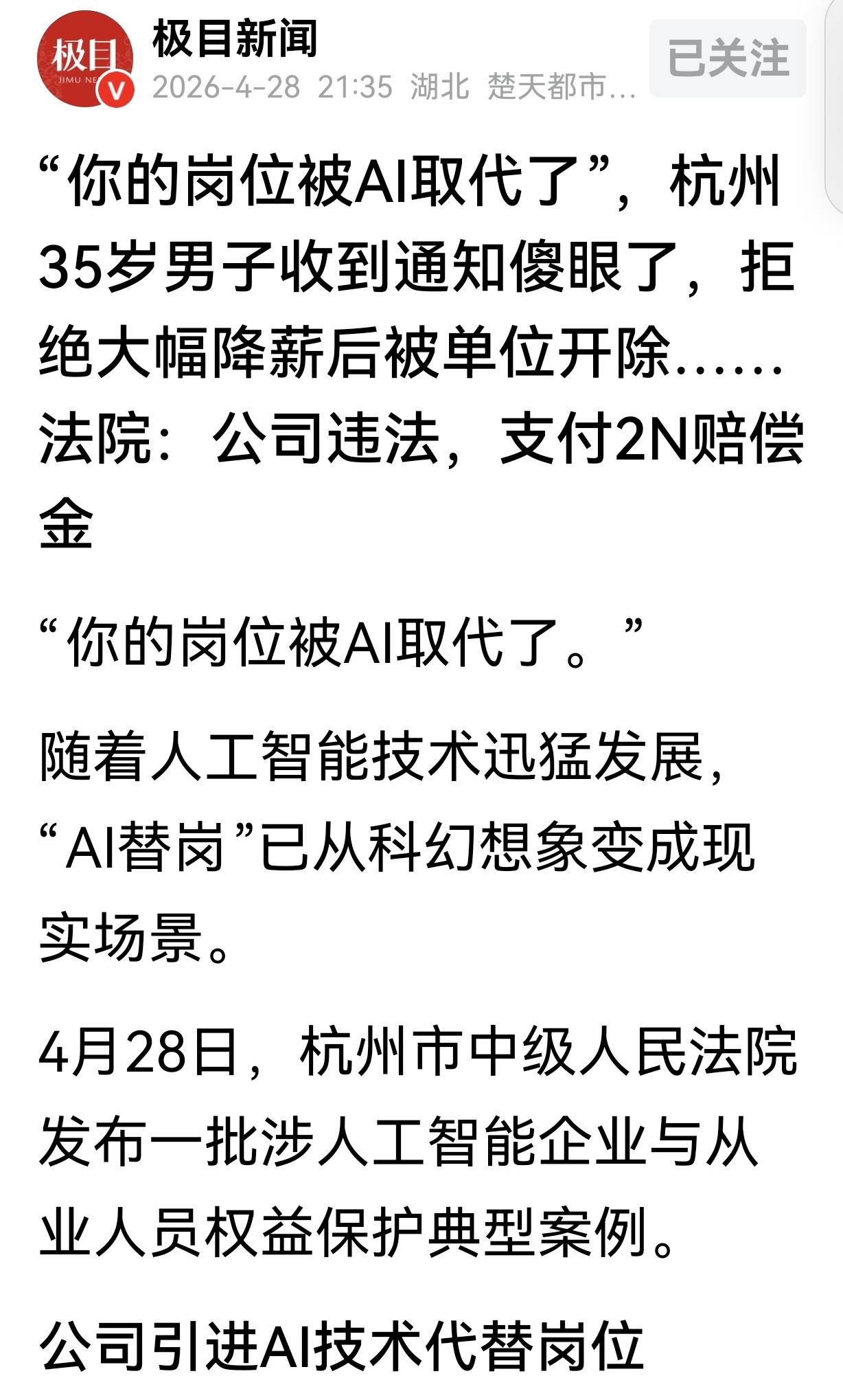 以后再碰到公司拿“AI替岗”当理由降薪开人,劳动者完全可以拿着这个判例维护权益,技术再怎么变,保护劳动者合法权益的底线不会变。