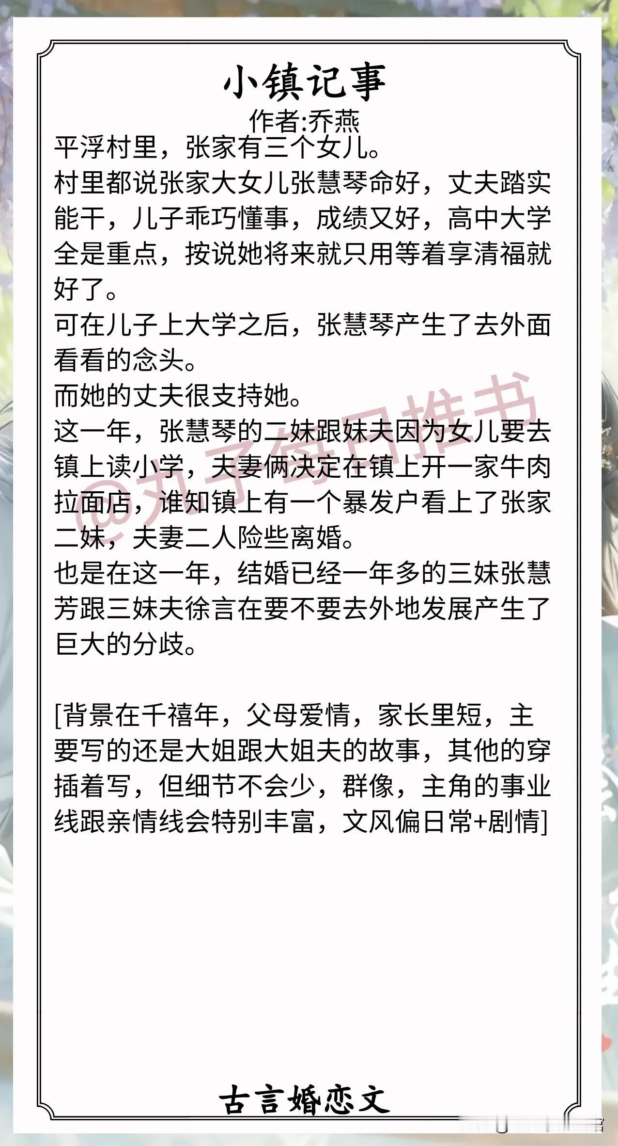 5.《小镇记事》作者:乔燕(成长型女vs老实能干男,婚恋,父母爱情,家长里短)