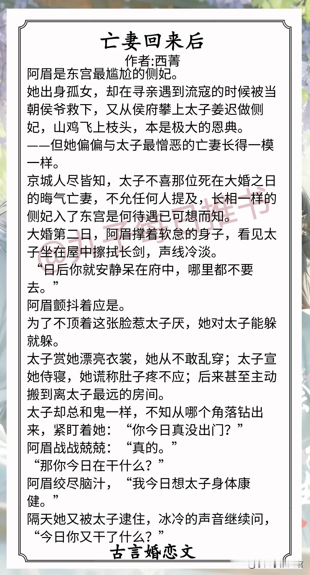 7.《亡妻回来后》作者:西菁(白月光美人vs傲娇高冷太子,伪替身,先婚后爱,古言甜宠文)