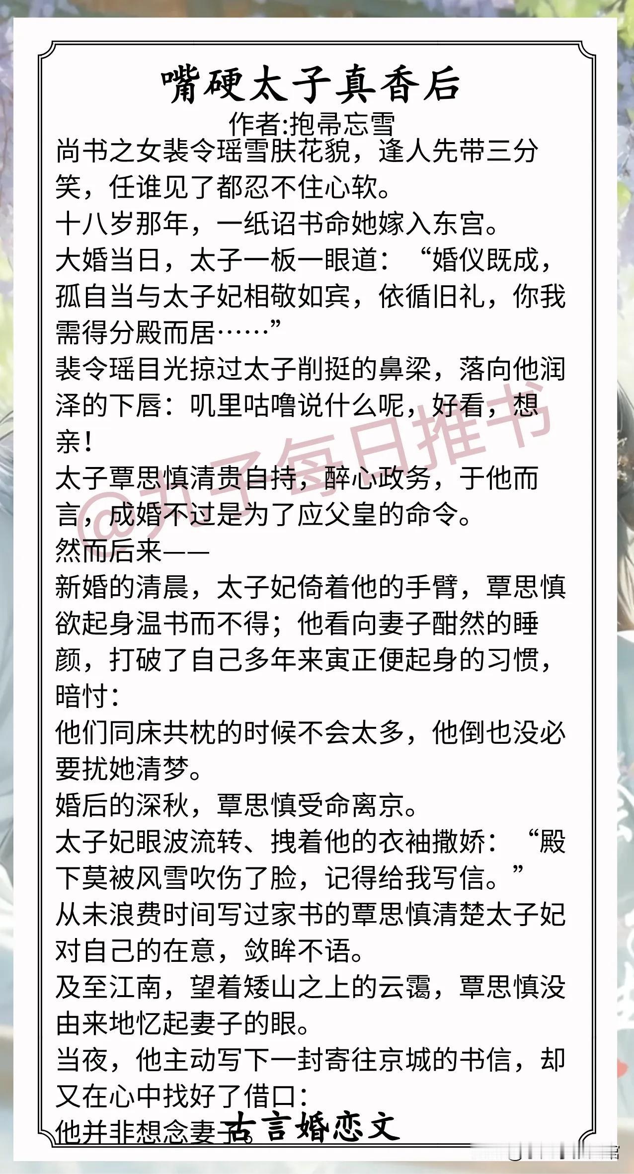 6.《嘴硬太子真香后》作者:抱帚忘雪(直球小太阳vs嘴硬死装哥,少年夫妻,先婚后爱,古言小甜饼)