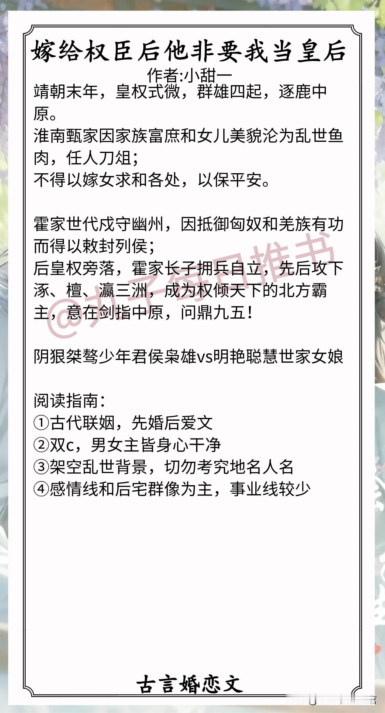 3.《嫁给权臣后他非要我当皇后》作者:小甜一(聪慧伶俐贵女vs桀骜少年枭雄,古代联姻,少年夫妻,先婚后爱,乱世背景)