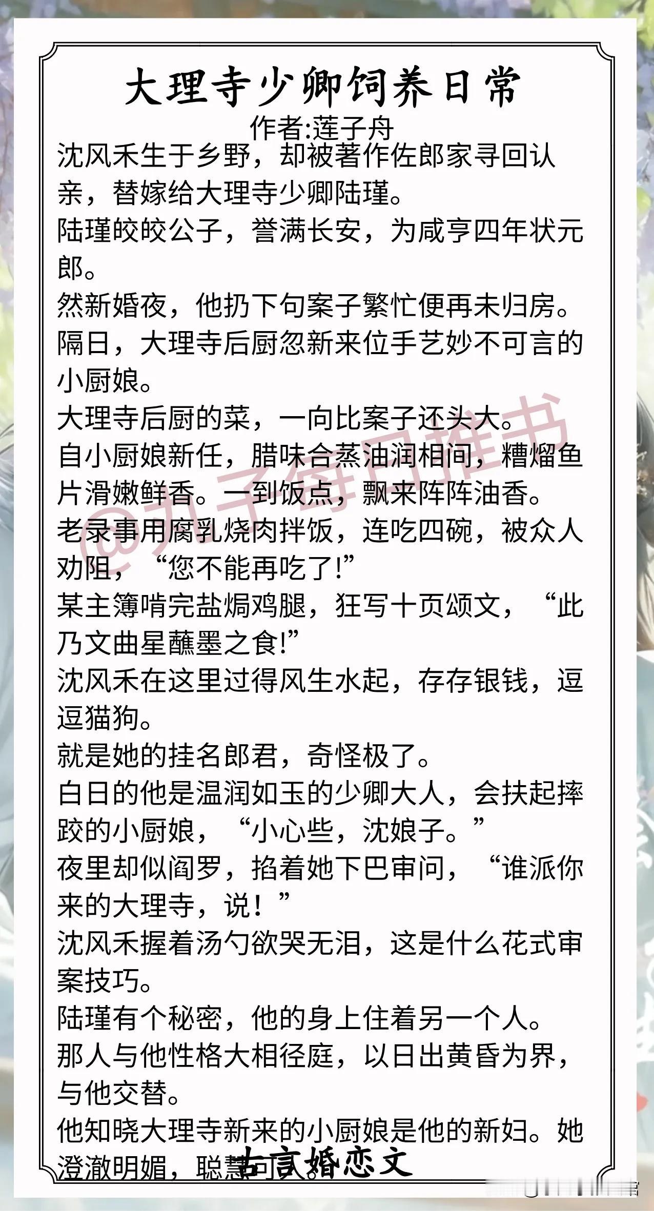 4.《大理寺少卿饲养日常》作者:莲子舟(明媚小厨娘vs双重人格少卿,替嫁,先婚后爱,美食探案,甜宠日常)