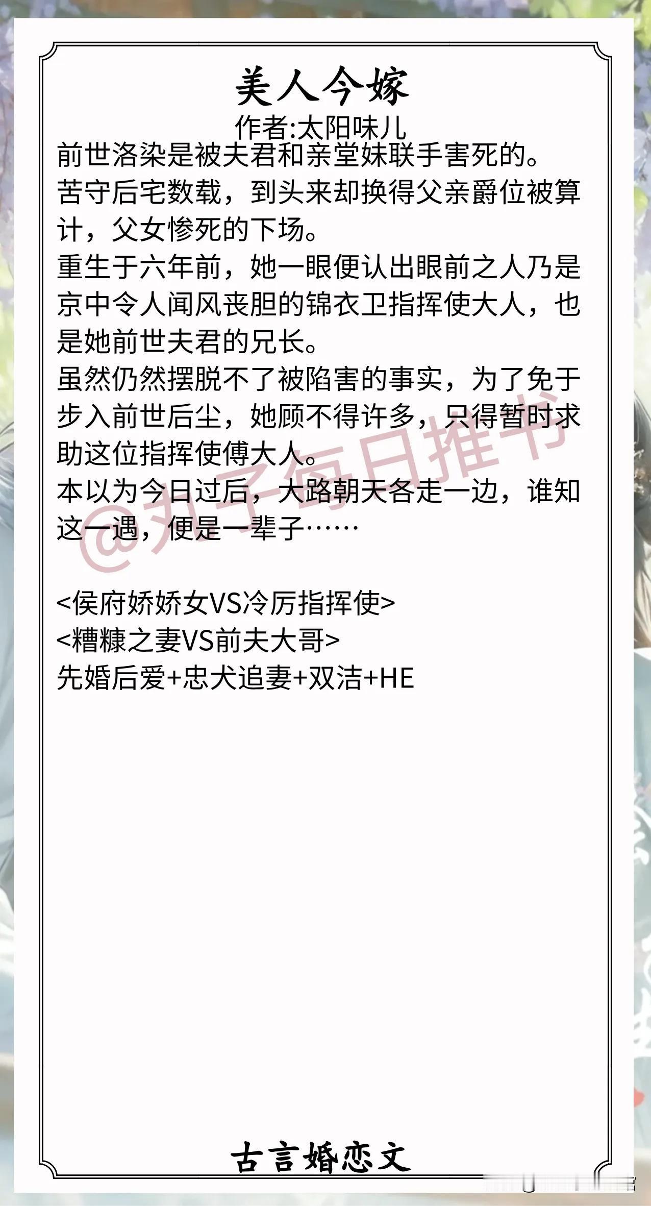 9.《美人今嫁》作者:太阳味儿(侯府娇娇女vs冷厉指挥使,重生,先婚后爱,弟媳文学)小说 推文