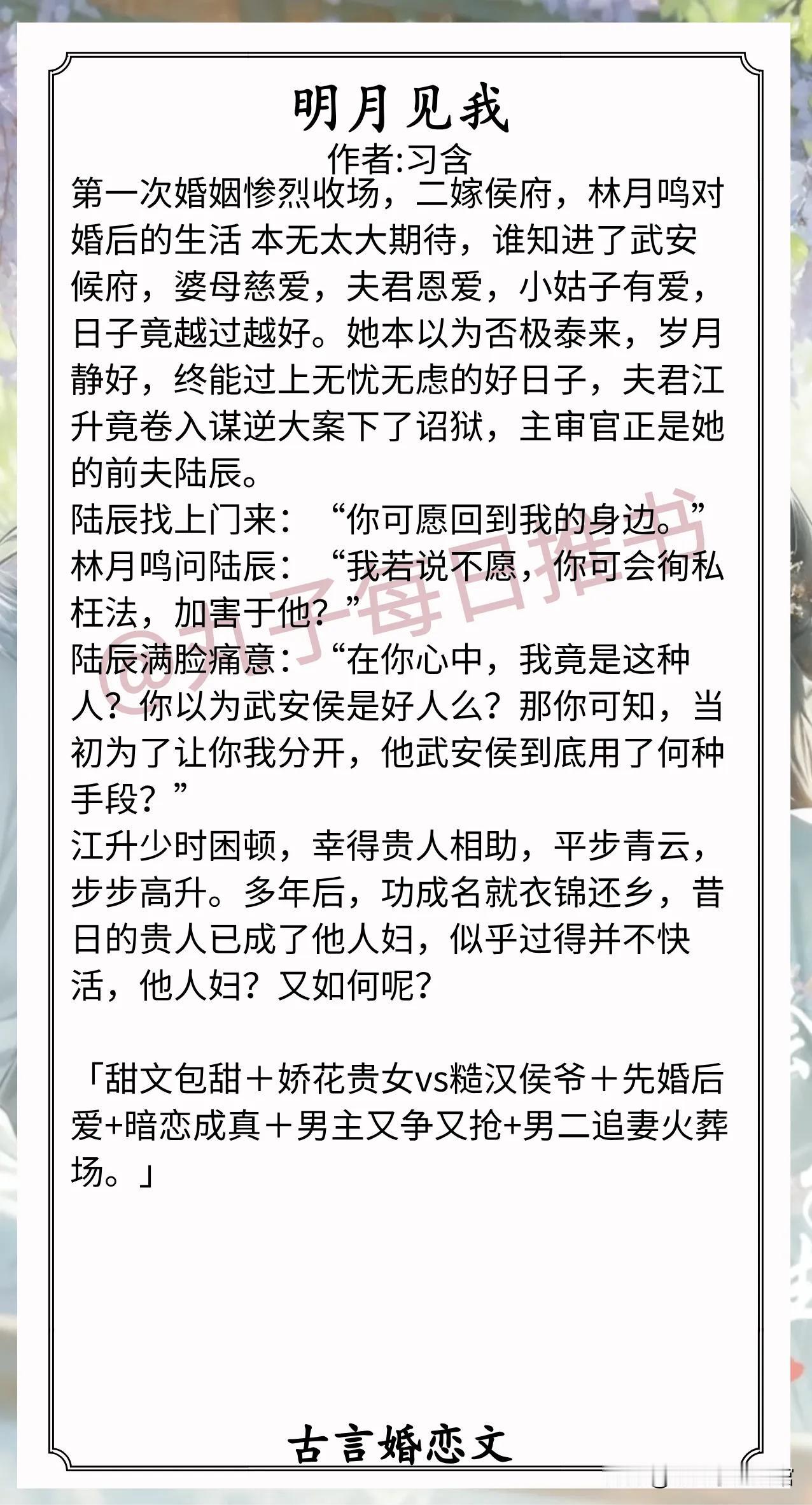 2.《明月见我》作者:习含(娇花贵女vs糙汉侯爷,先婚后爱,又争又抢,前任追妻失败)