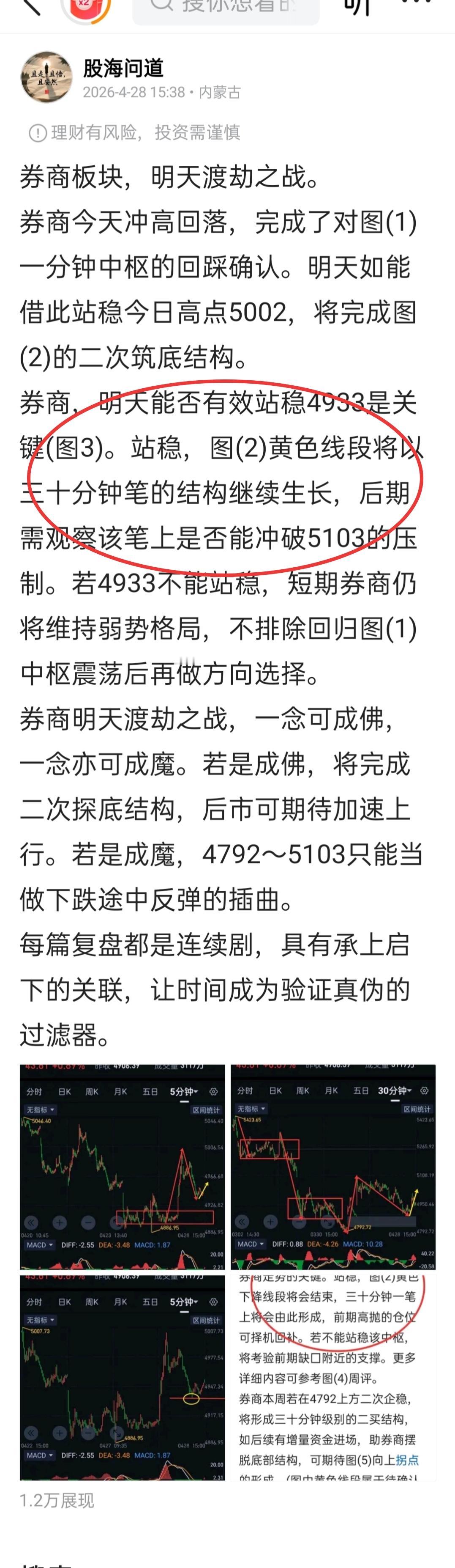 券商板块,亦可乘风破万里。 券商,今天探底企稳,目前仍处于图(1)三十分钟一笔上的生长中。该笔上如能重新站回5103,券商将完成阶段筑底结构。该笔上能否顺利站上5103,明天将是重要走势节点。 券商,图(1)黄色三十分钟一笔上,在次级别(图2)以形成一分钟盘整上的结构。明天能否有效站稳图(2)中枢是关键。站稳,图(1)黄色线段将继续向上延伸,可用一分钟级别结构跟随走势的生长。若不能站稳图(2)中枢,券商将回归弱势结构,要适当调整仓位,后期要防止券商向4792附近寻找支撑。 券商明天变盘窗口期,涨跌一念之间。若是尘尽光生,可照破青山万朵。