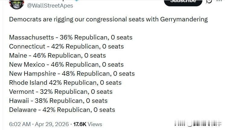 民主党正在通过“选区划分”操纵国会席位。 - 马萨诸塞州:共和党支持率36%