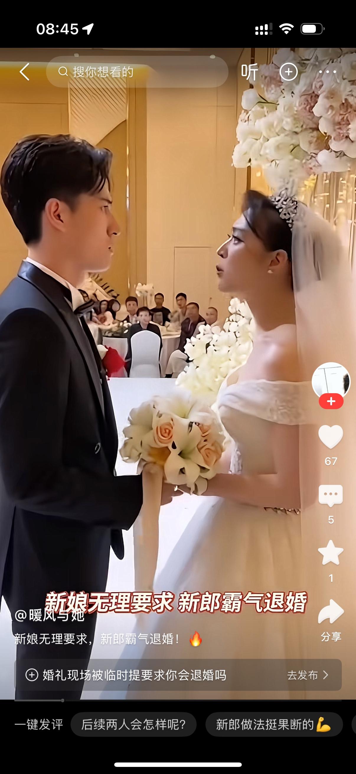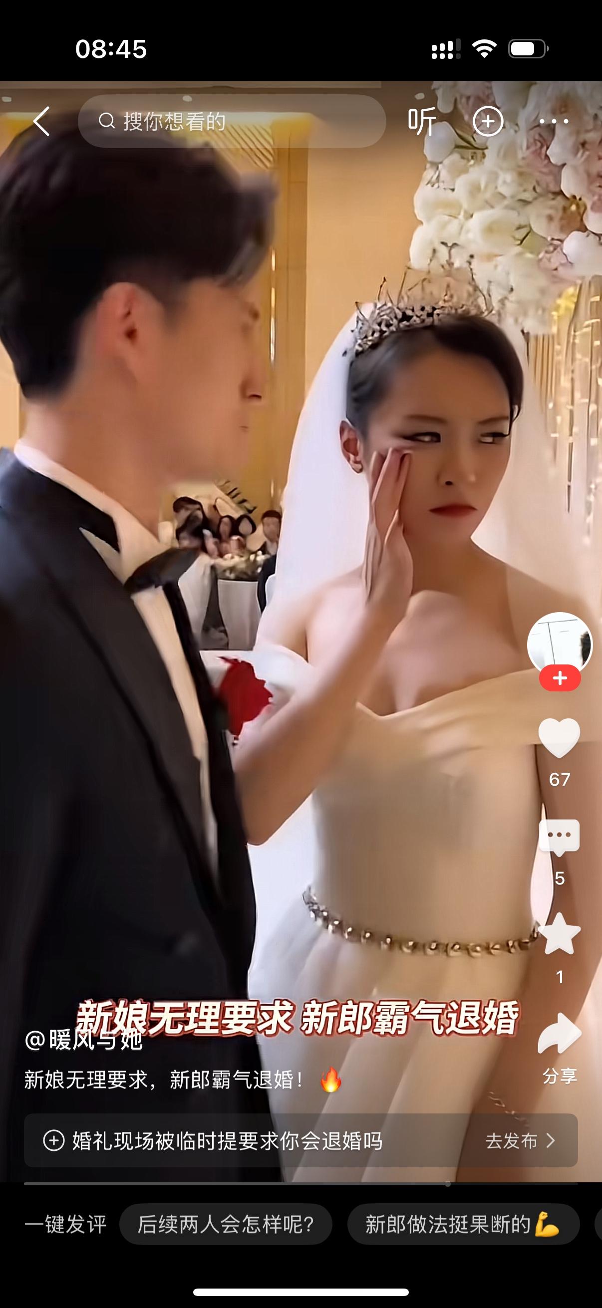 婚礼仪式正在举行,新娘突然当着亲友的面对新郎大喊,我妈说彩礼得再加38万8,不加的话,这个婚就不结了。新郎的笑容顿时凝固了,他没想到关键时刻,新娘会再摆自己一道。新郎心一横,大声说,不结就不结。新郎扯掉礼花,转身就离开。新娘有点懵了,他没想到新郎居然会这样跟自己说,电视上演的男的不都是跪地求饶或者爽快加钱吗?