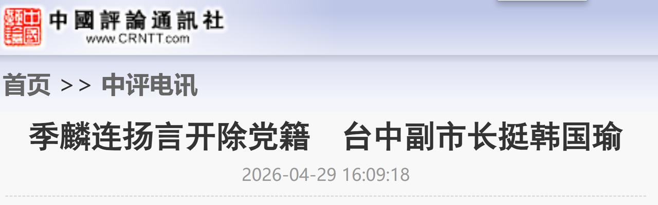 信源: 中评电讯季麟连扬言开除党籍 台中副市长挺韩国瑜 2026-04-29 16:09:18
