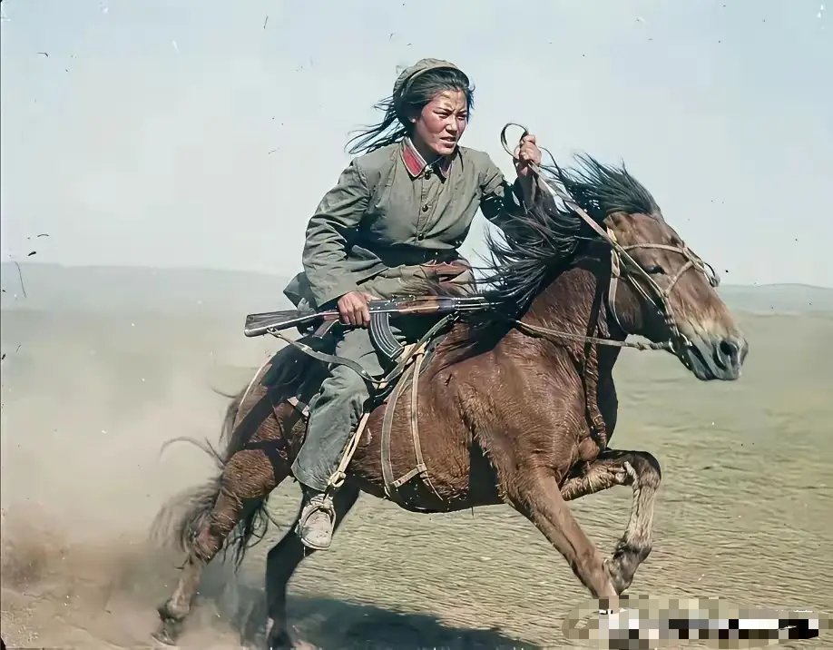 这是一张70年代,人民解放军的一名女战士在策马扬鞭训练时的情景